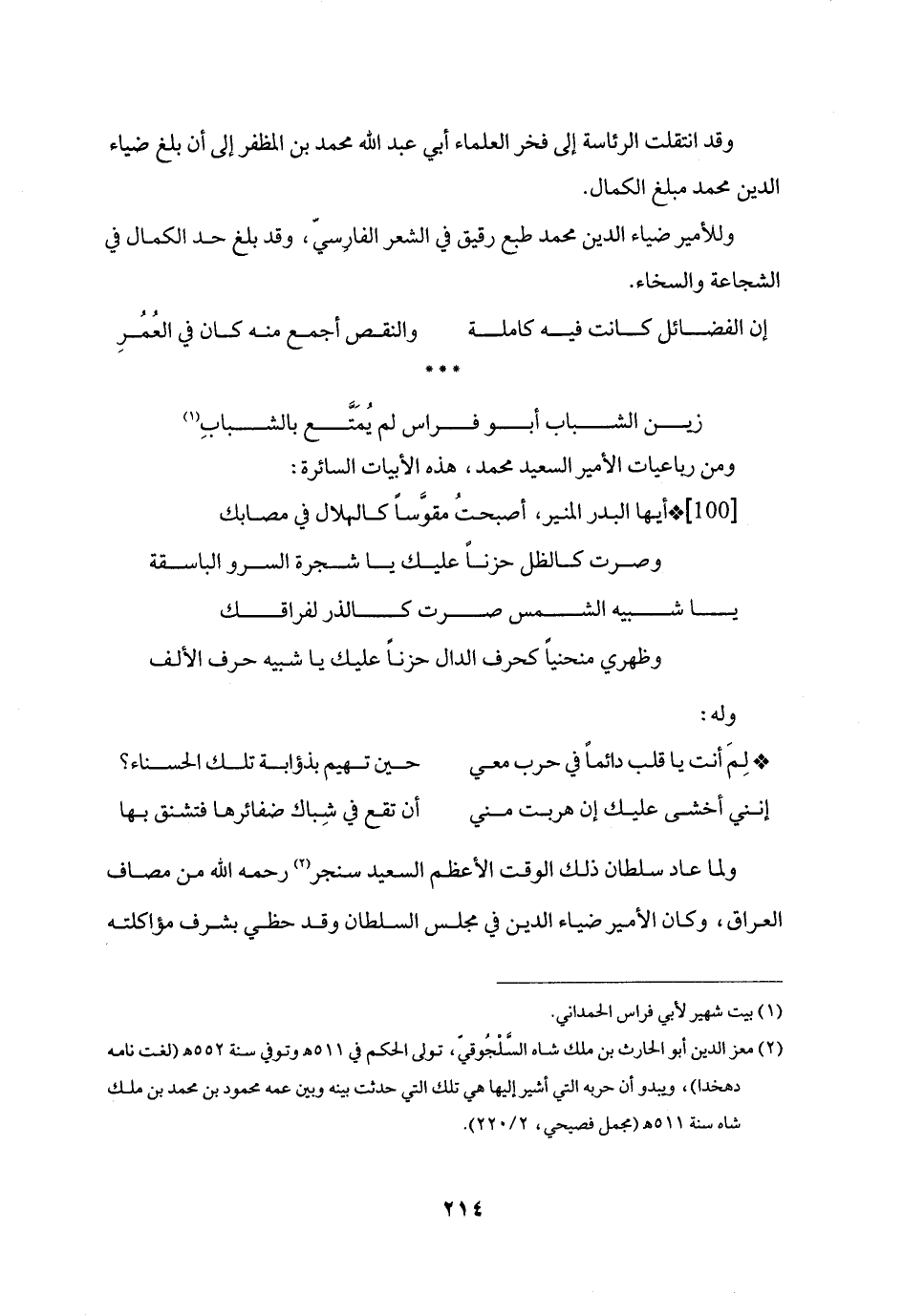 ولما عاد سلطان ذلك الوقت الأعظم السعيد سنجر «2» رحمه الله من مصاف العراق، وكان الأمير ضياء الدين في مجلس السلطان وقد حظي بشرف مؤاكلته