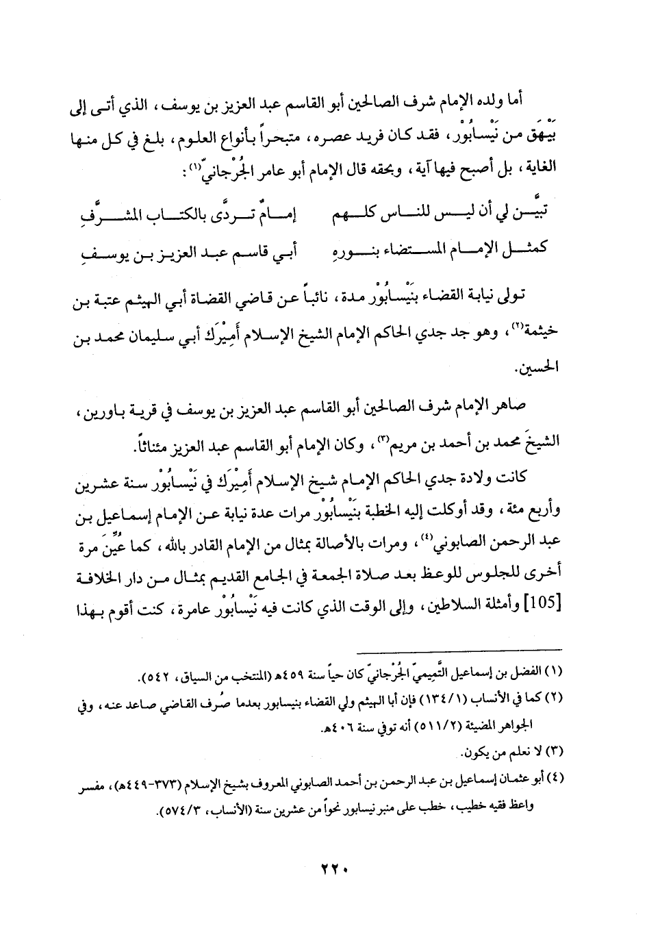 كانت ولادة جدي الحاكم الإمام شيخ الإسلام أميرك في نيسابور سنة عشرين وأربع مئة، وقد أوكلت إليه الخطبة بنيسابور مرات عدة نيابة عن الإمام إسماعيل بن عبد الرحمن الصابوني «4» ، ومرات بالأصالة بمثال من الإمام القادر بالله، كما عيّن مرة أخرى للجلوس للوعظ بعد صلاة الجمعة في الجامع القديم بمثال من دار الخلافة [105] وأمثلة السلاطين، وإلى الوقت الذي كانت فيه نيسابور عامرة، كنت أقوم بهذا