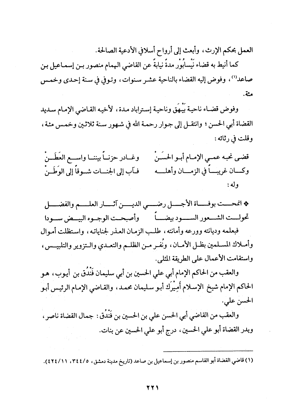 كما أنيط به قضاء نيسابور مدة نيابة عن القاضي الهمام منصور بن إسماعيل بن صاعد «1» ، وفوض إليه القضاء بالناحية عشر سنوات، وتوفي في سنة إحدى وخمس مئة.