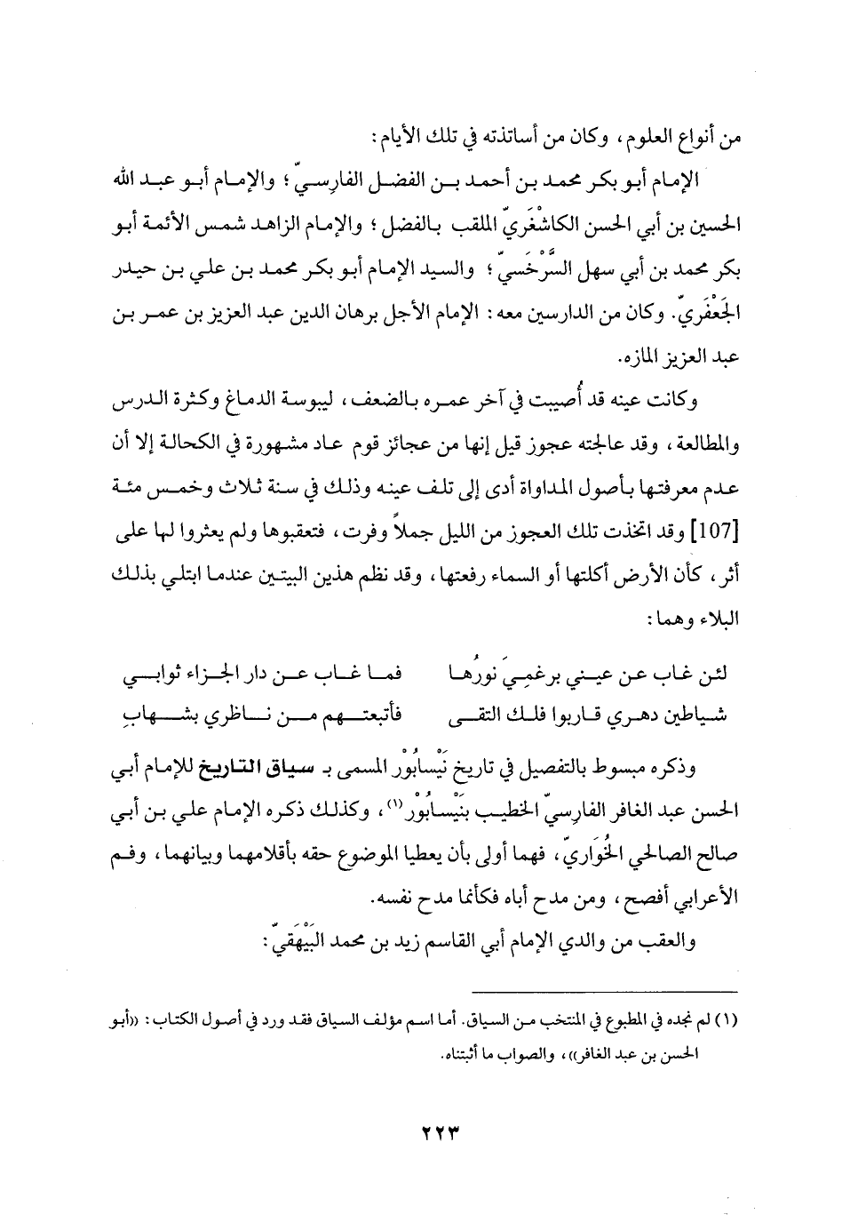 وذكره مبسوط بالتفصيل في تاريخ نيسابور المسمى ب سياق التاريخ للإمام أبي الحسن عبد الغافر الفارسيّ الخطيب بنيسابور «1» ، وكذلك ذكره الإمام علي بن أبي صالح الصالحي الخواريّ، فهما أولى بأن يعطيا الموضوع حقه بأقلامهما وبيانهما، وفم الأعرابي أفصح، ومن مدح أباه فكأنما مدح نفسه.