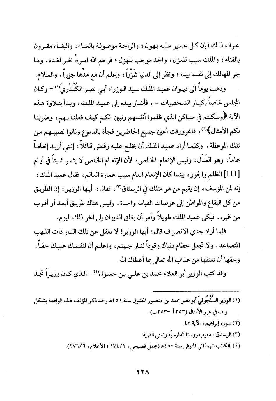 إنه لمن المؤسف، إن يقيم من هو مثلك في الرستاق «3» ، فقال: أيها الوزير: إن الطريق من كل البقاع والمواطن إلى عرصات القيامة واحدة، وليس هناك طريق أبعد أو أقرب من غيره، فبكى عميد الملك طويلا وأمر أن يغلق الديوان إلى آخر ذلك اليوم.