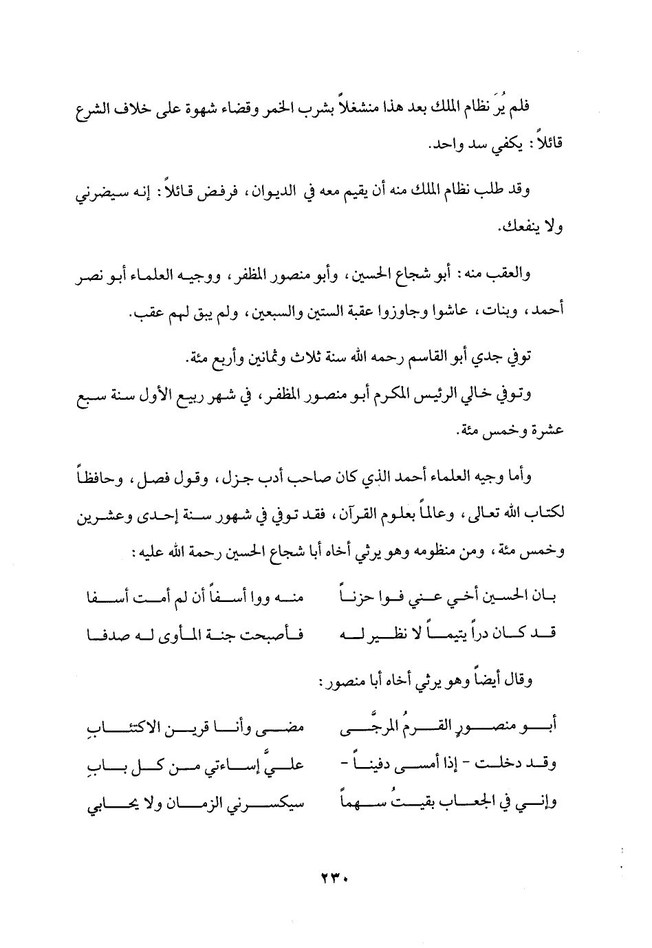 وأما وجيه العلماء أحمد الذي كان صاحب أدب جزل، وقول فصل، وحافظا لكتاب الله تعالى، وعالما بعلوم القرآن، فقد توفي في شهور سنة إحدى وعشرين وخمس مئة، ومن منظومه وهو يرثي أخاه أبا شجاع الحسين رحمة الله عليه: