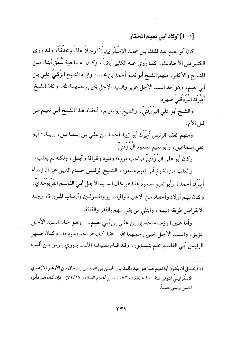 كان أبو نعيم عبد الملك بن محمد الإسفرايينيّ «1» رجلا عالما ومحدّثا، وقد روى الكثير من الأحاديث، كما روي عنه الكثير أيضا، وكان له بناحية بيهق أبناء من المشايخ والأكابر، منهم الشيخ أبو نعيم أحمد بن محمد، وابنه الشيخ الزّكيّ علي بن أبي نعيم، وهو جد السيد الأجل عزيز والسيد الأجل يحيى رحمهما الله، وكان الشيخ أميرك البروقنيّ صهره.