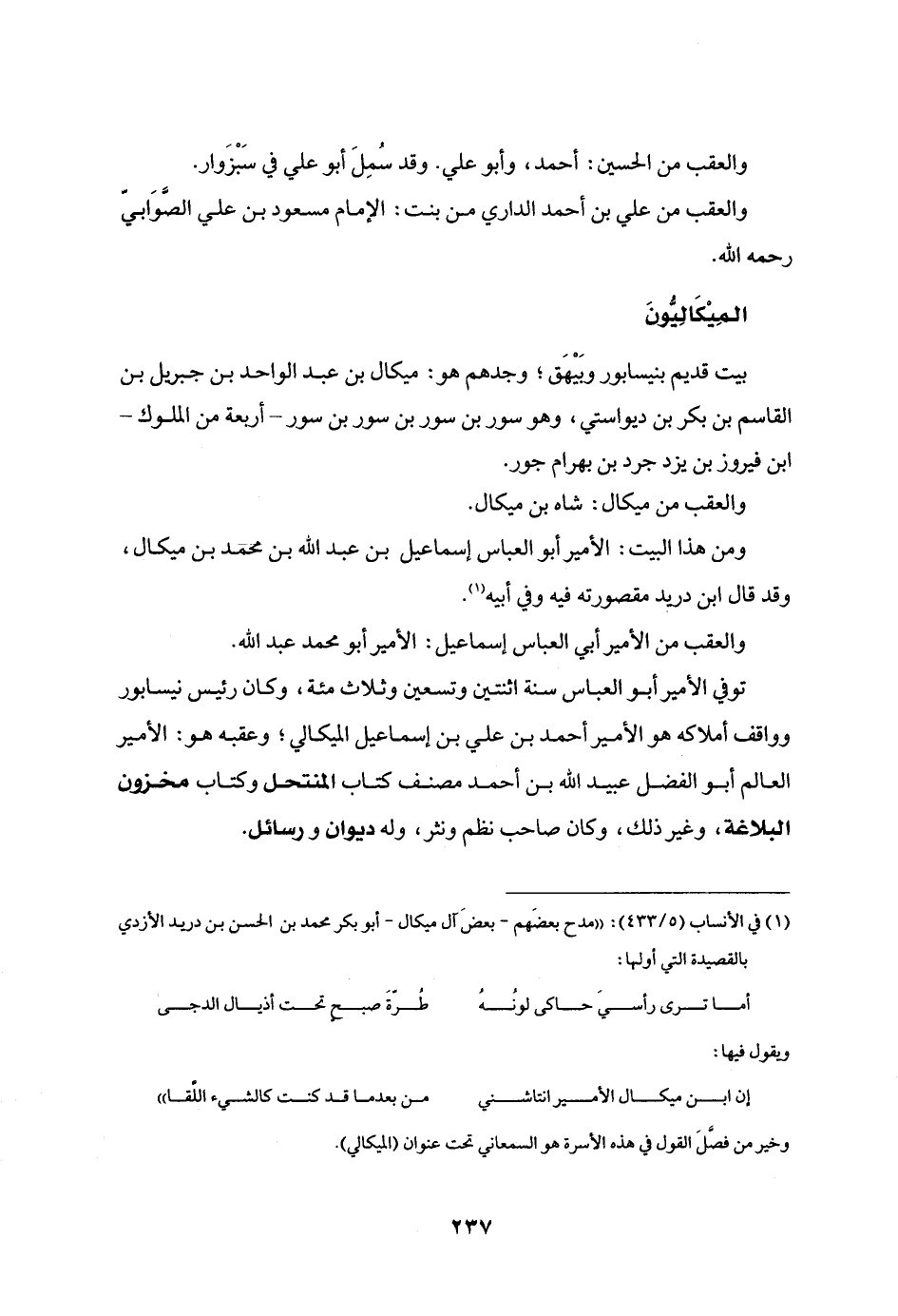 ومن هذا البيت: الأمير أبو العباس إسماعيل بن عبد الله بن محمد بن ميكال، وقد قال ابن دريد مقصورته فيه وفي أبيه «1» .