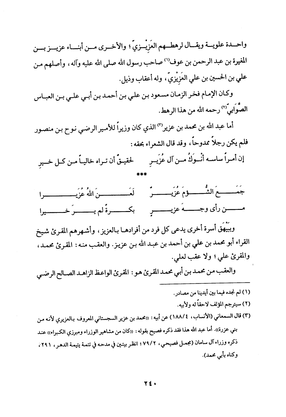 أما عبد الله بن محمد بن عزير «3» الذي كان وزيرا للأمير الرضي نوح بن منصور فلم يكن رجلا ممدوحا، وقد قال الشعراء بحقه: