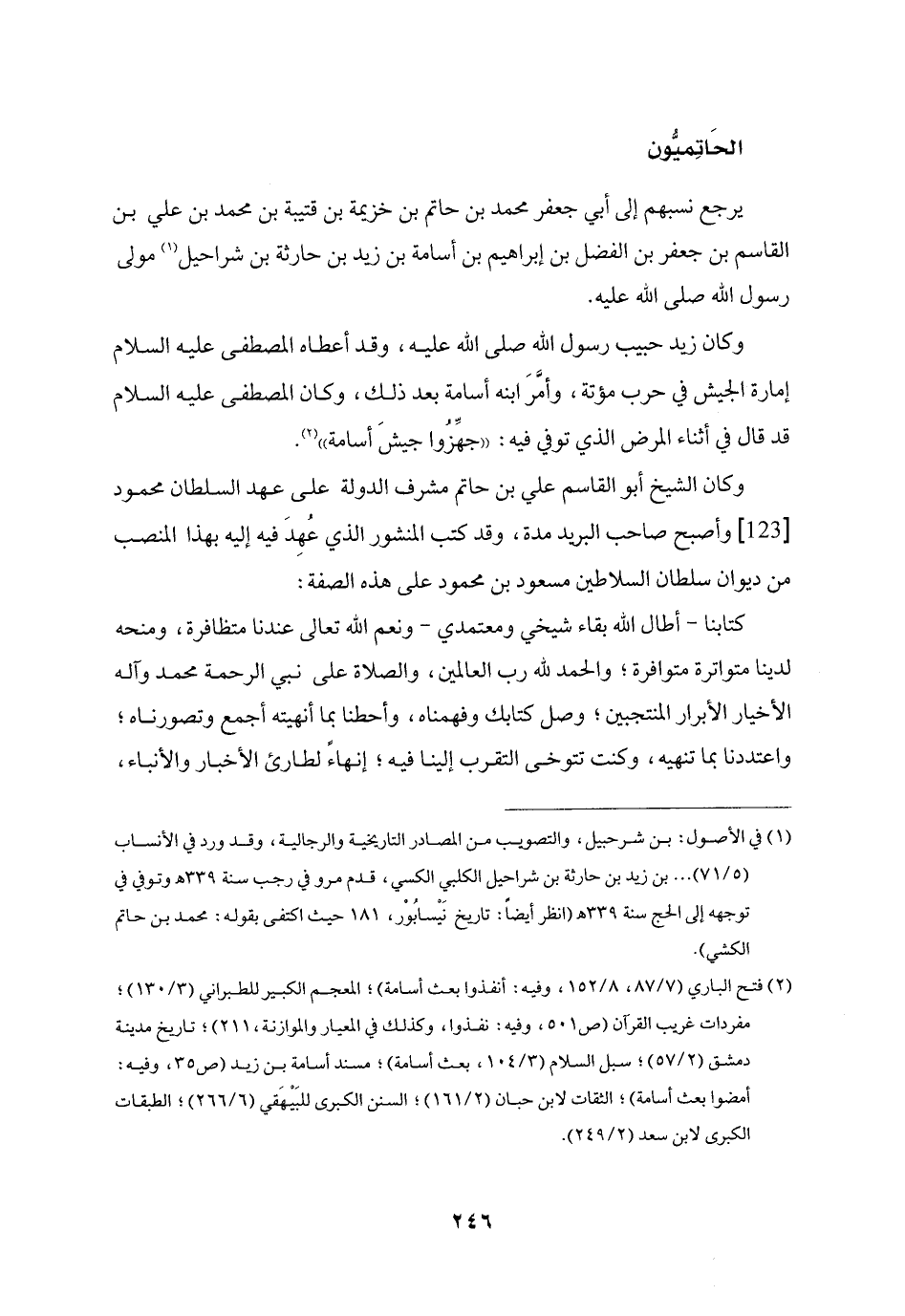 وكان الشيخ أبو القاسم علي بن حاتم مشرف الدولة على عهد السلطان محمود [123] وأصبح صاحب البريد مدة، وقد كتب المنشور الذي عهد فيه إليه بهذا المنصب من ديوان سلطان السلاطين مسعود بن محمود على هذه الصفة: