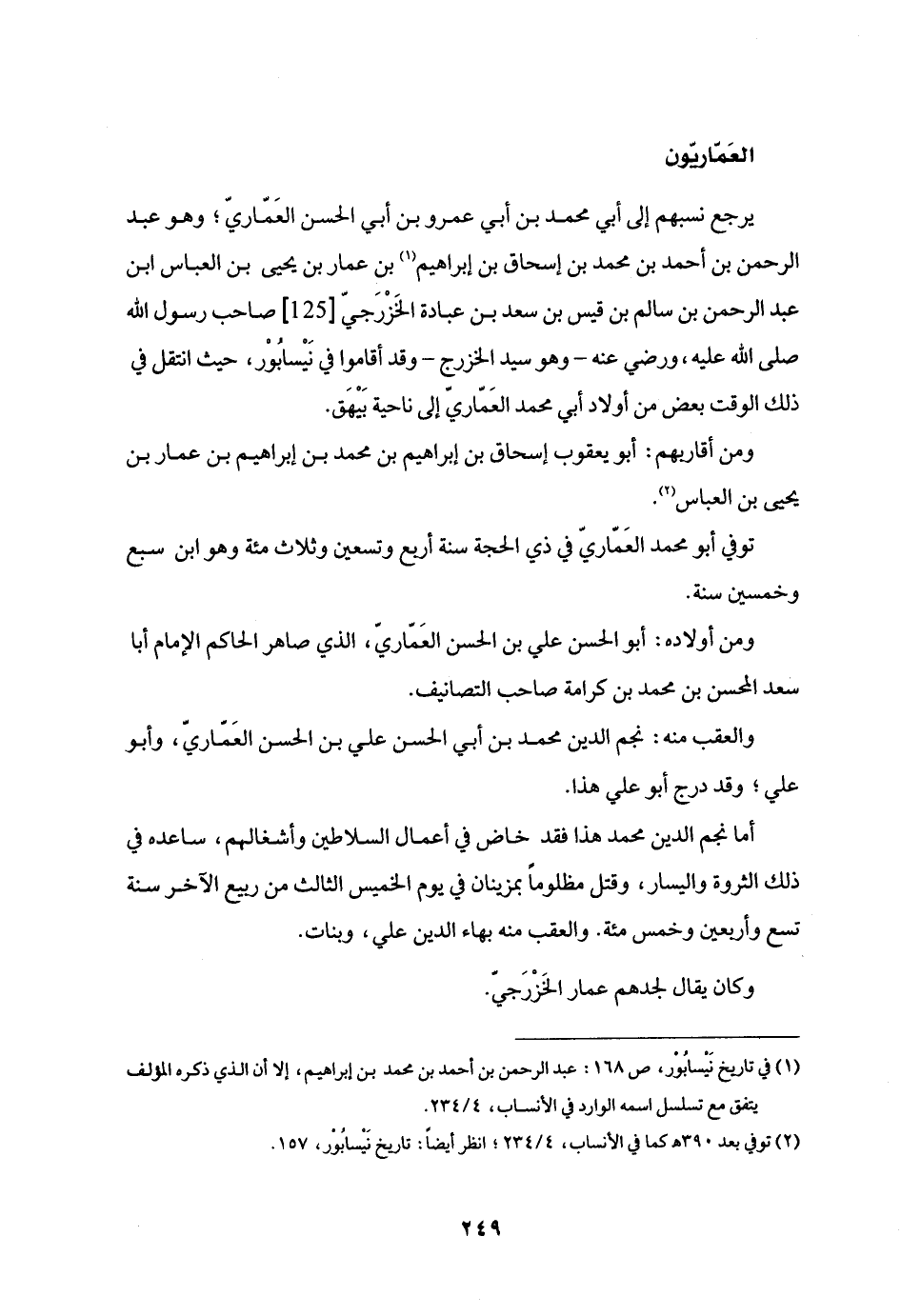 يرجع نسبهم إلى أبي محمد بن أبي عمرو بن أبي الحسن العمّاريّ؛ وهو عبد الرحمن بن أحمد بن محمد بن إسحاق بن إبراهيم «1» بن عمار بن يحيى بن العباس ابن عبد الرحمن بن سالم بن قيس بن سعد بن عبادة الخزرجيّ [125] صاحب رسول الله صلى الله عليه، ورضي عنه- وهو سيد الخزرج- وقد أقاموا في نيسابور، حيث انتقل في ذلك الوقت بعض من أولاد أبي محمد العمّاريّ إلى ناحية بيهق.