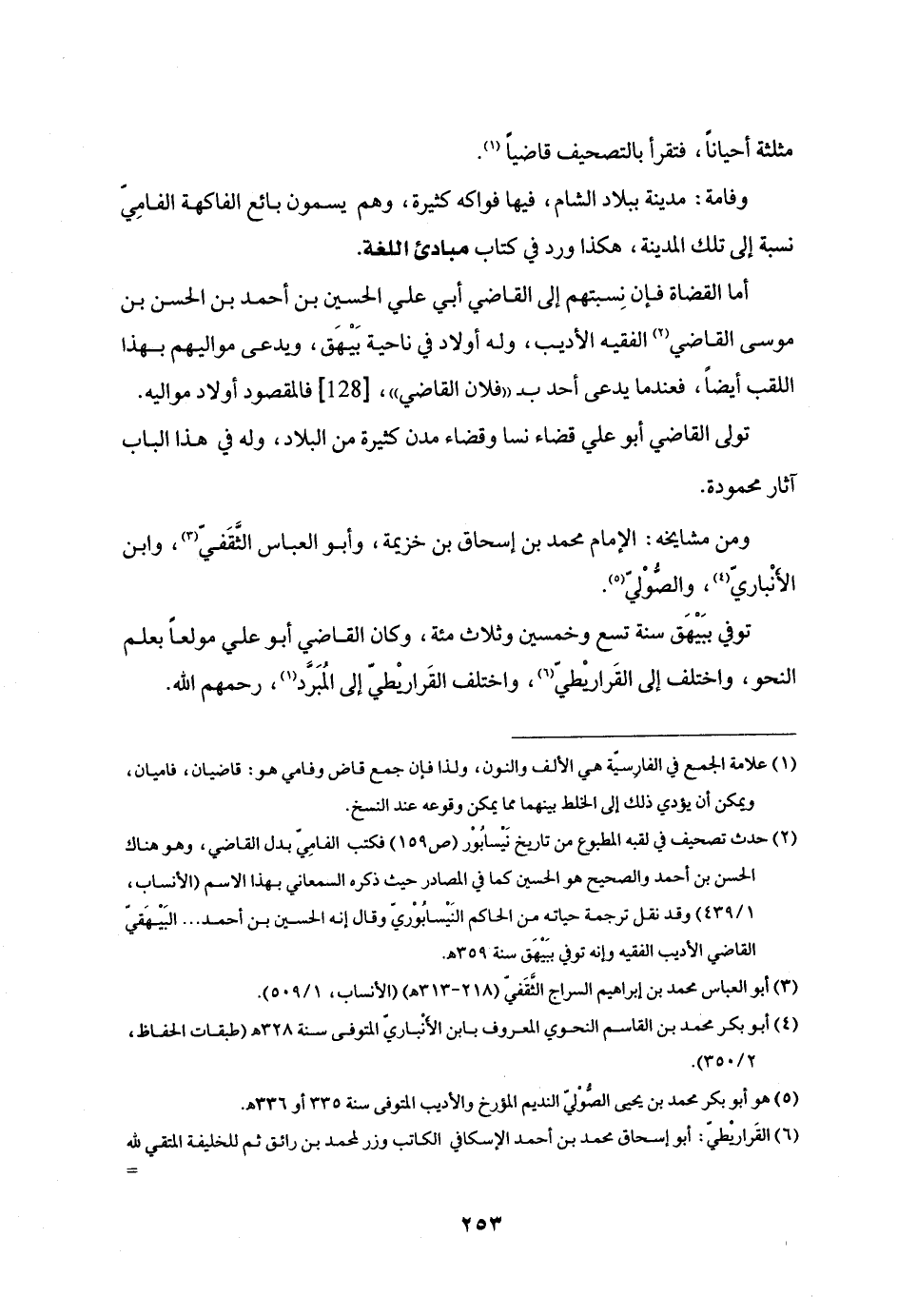 أما القضاة فإن نسبتهم إلى القاضي أبي علي الحسين بن أحمد بن الحسن بن موسى القاضي «2» الفقيه الأديب، وله أولاد في ناحية بيهق، ويدعى مواليهم بهذا اللقب أيضا، فعندما يدعى أحد ب «فلان القاضي» ، [128] فالمقصود أولاد مواليه.