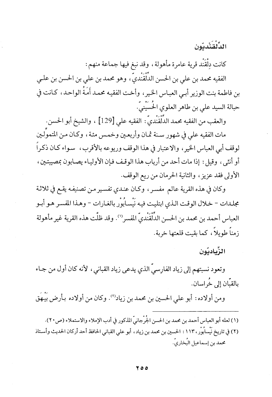 وكان في هذه القرية عالم مفسر، وكان عندي تفسير من تصنيفه يقع في ثلاثة مجلدات- خلال الوقت الذي ابتليت فيه نيسابور بالغارات- وهذا المفسر هو أبو العباس أحمد بن محمد بن الحسن الدّلقنديّ المفسر «1» . وقد ظلّت هذه القرية غير مأهولة زمنا طويلا، كما بقيت قلعتها خربة.