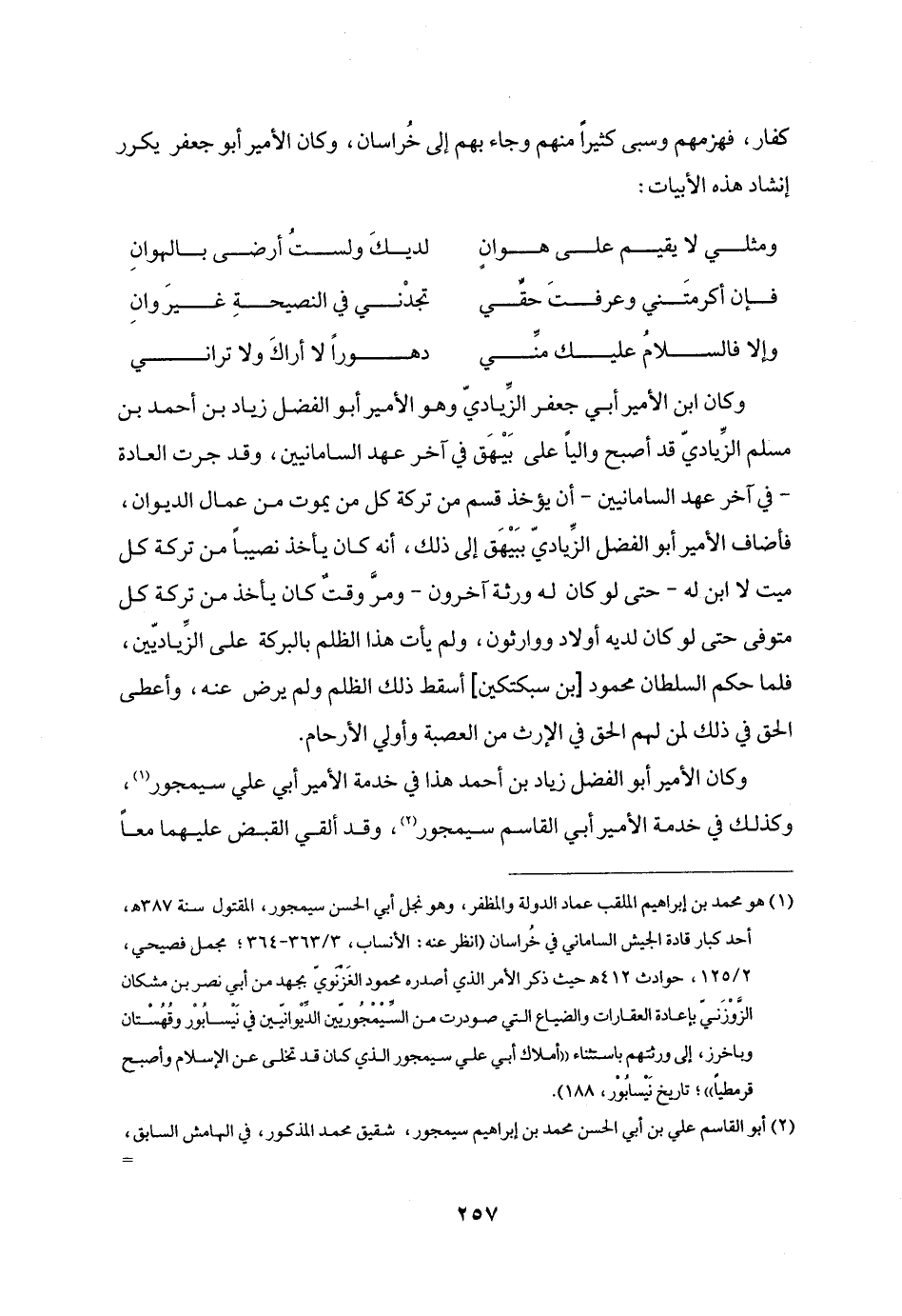 وكان الأمير أبو الفضل زياد بن أحمد هذا في خدمة الأمير أبي علي سيمجور «1» ، وكذلك في خدمة الأمير أبي القاسم سيمجور «2» ، وقد ألقي القبض عليهما معا