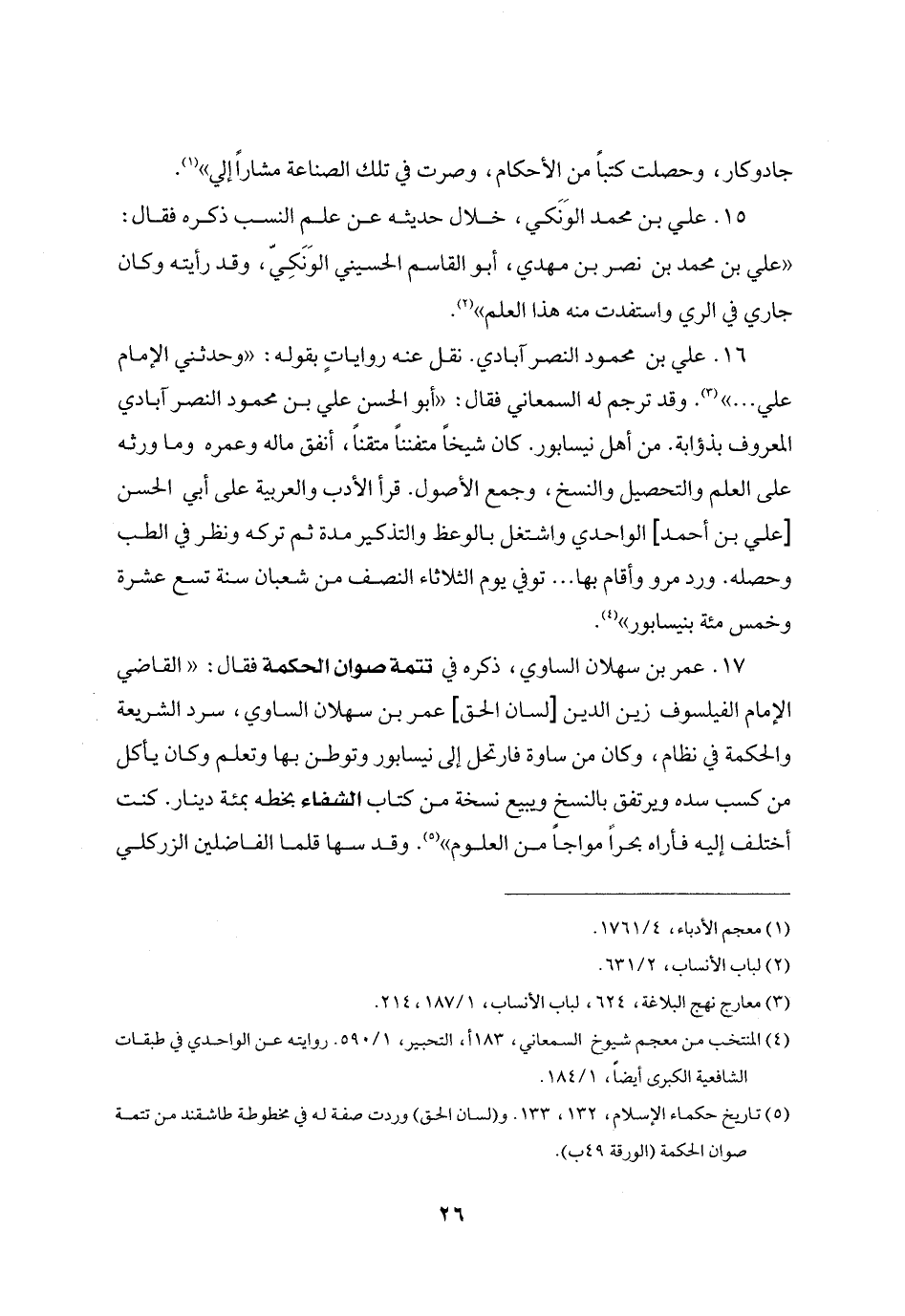 17. عمر بن سهلان الساوي، ذكره في تتمة صوان الحكمة فقال: «القاضي الإمام الفيلسوف زين الدين [لسان الحق] عمر بن سهلان الساوي، سرد الشريعة والحكمة في نظام، وكان من ساوة فارتحل إلى نيسابور وتوطن بها وتعلم وكان يأكل من كسب سده ويرتفق بالنسخ ويبيع نسخة من كتاب الشفاء بخطه بمائة دينار. كنت أختلف إليه فأراه بحرا مواجا من العلوم» «5» . وقد سها قلما الفاضلين الزركلي