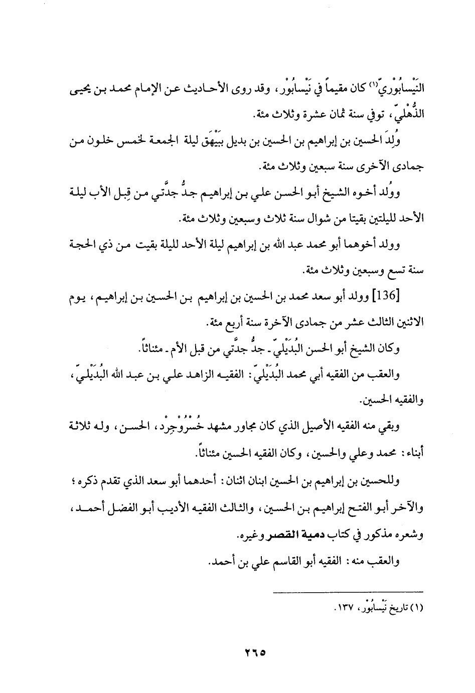 [136] وولد أبو سعد محمد بن الحسين بن إبراهيم بن الحسين بن إبراهيم، يوم الاثنين الثالث عشر من جمادى الآخرة سنة أربع مئة.