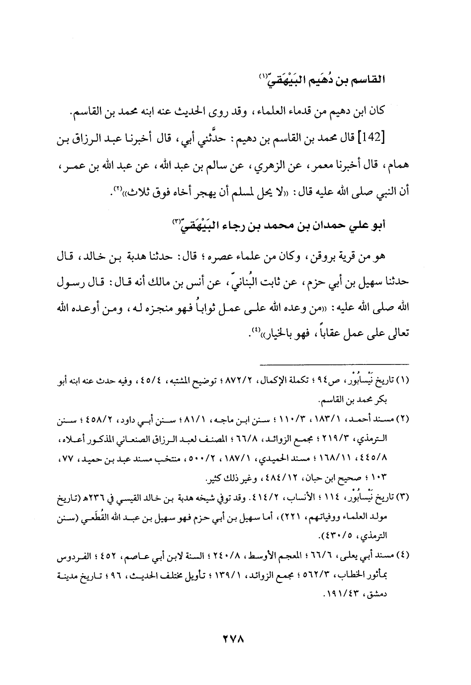 [142] قال محمد بن القاسم بن دهيم: حدّثني أبي، قال أخبرنا عبد الرزاق بن همام، قال أخبرنا معمر، عن الزهري، عن سالم بن عبد الله، عن عبد الله بن عمر، أن النبي صلى الله عليه قال: «لا يحل لمسلم أن يهجر أخاه فوق ثلاث» «2» .