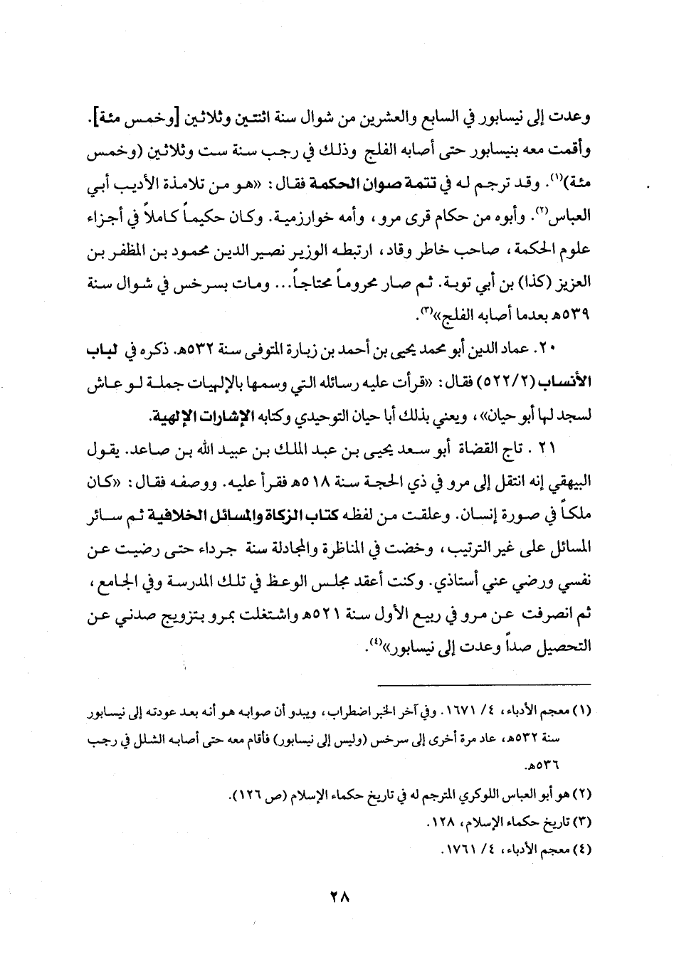 وأقمت معه بنيسابور حتى أصابه الفلج وذلك في رجب سنة ست وثلاثين (وخمس مئة) «1» . وقد ترجم له في تتمة صوان الحكمة فقال: «هو من تلامذة الأديب أبي العباس «2» . وأبوه من حكام قرى مرو، وأمه خوارزمية. وكان حكيما كاملا في أجزاء علوم الحكمة، صاحب خاطر وقاد، ارتبطه الوزير نصير الدين محمود بن المظفر بن العزيز (كذا) بن أبي توبة. ثم صار محروما محتاجا ... ومات بسرخس في شوال سنة 539 هـ بعد ما أصابه الفلج» «3» .