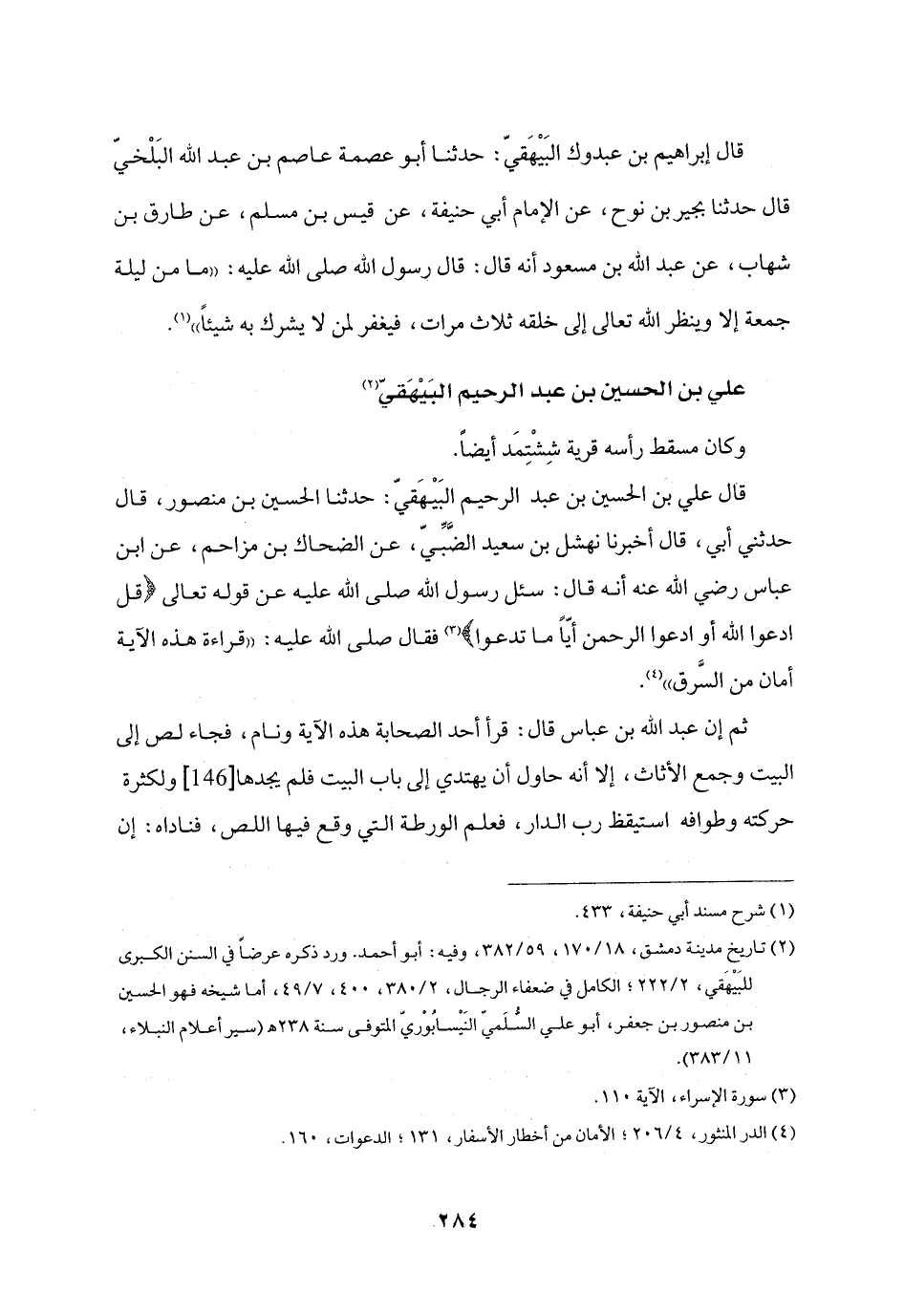 قال إبراهيم بن عبدوك البيهقيّ: حدثنا أبو عصمة عاصم بن عبد الله البلخيّ قال حدثنا بجير بن نوح، عن الإمام أبي حنيفة، عن قيس بن مسلم، عن طارق بن شهاب، عن عبد الله بن مسعود أنه قال: قال رسول الله صلى الله عليه: «ما من ليلة جمعة إلا وينظر الله تعالى إلى خلقه ثلاث مرات، فيغفر لمن لا يشرك به شيئا» «1» .
