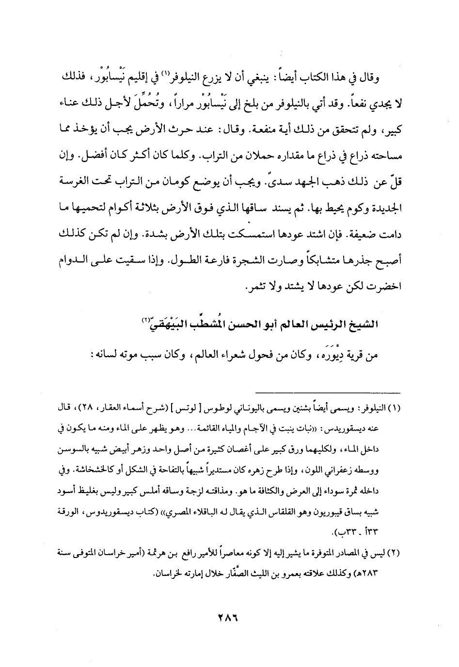 وقال في هذا الكتاب أيضا: ينبغي أن لا يزرع النيلوفر «1» في إقليم نيسابور، فذلك لا يجدي نفعا. وقد أتي بالنيلوفر من بلخ إلى نيسابور مرارا، وتحمّل لأجل ذلك عناء كبير، ولم تتحقق من ذلك أية منفعة. وقال: عند حرث الأرض يجب أن يؤخذ مما مساحته ذراع في ذراع ما مقداره حملان من التراب. وكلما كان أكثر كان أفضل. وإن قلّ عن ذلك ذهب الجهد سدى. ويجب أن يوضع كومان من التراب تحت الغرسة الجديدة وكوم يحيط بها. ثم يسند ساقها الذي فوق الأرض بثلاثة أكوام لتحميها ما دامت ضعيفة. فإن اشتد عودها استمسكت بتلك الأرض بشدة. وإن لم تكن كذلك أصبح جذرها متشابكا وصارت الشجرة فارعة الطول. وإذا سقيت على الدوام اخضرت لكن عودها لا يشتد ولا تثمر.
