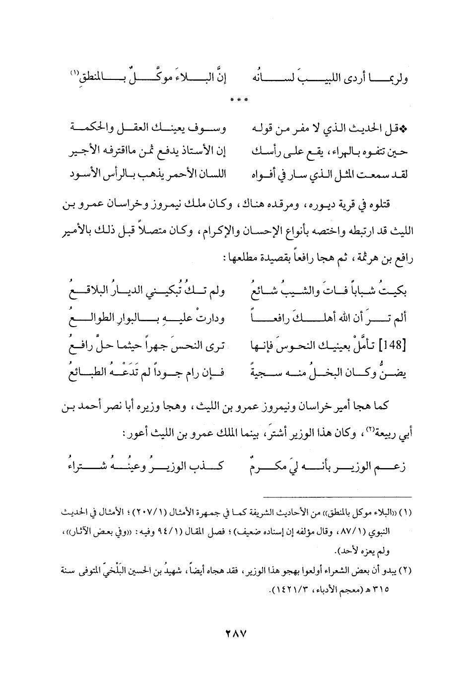 كما هجا أمير خراسان ونيمروز عمرو بن الليث، وهجا وزيره أبا نصر أحمد بن أبي ربيعة «2» ، وكان هذا الوزير أشتر، بينما الملك عمرو بن الليث أعور:
