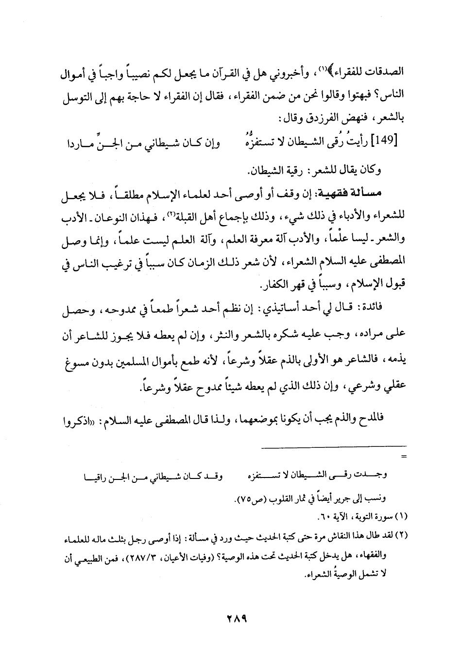 مسألة فقهية: إن وقف أو أوصى أحد لعلماء الإسلام مطلقا، فلا يجعل للشعراء والأدباء في ذلك شيء، وذلك بإجماع أهل القبلة «2» ، فهذان النوعان- الأدب والشعر- ليسا علما، والأدب آلة معرفة العلم، وآلة العلم ليست علما، وإنما وصل المصطفى عليه السلام الشعراء، لأن شعر ذلك الزمان كان سببا في ترغيب الناس في قبول الإسلام، وسببا في قهر الكفار.
