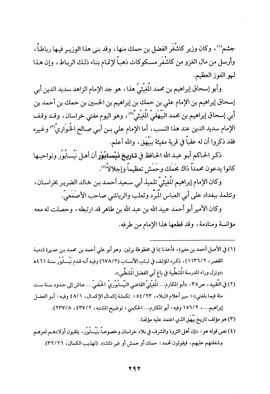 وأبو إسحاق إبراهيم بن محمد المغيثيّ هذا، هو جد الإمام الزاهد سديد الدين أبي إسحاق إبراهيم بن الإمام علي بن حمك بن إبراهيم بن الحسين بن حمك بن أحمد بن أبي إسحاق إبراهيم بن محمد البيهقيّ المغيثيّ «2» ، وهو اليوم مفتي خراسان، وقد وقف الإمام سديد الدين عند هذا النسب، أما الإمام علي بن أبي صالح الخواريّ «3» وغيره فقد ذكروا أن له عقبا في قرية مغيثة ببيهق، والله أعلم.