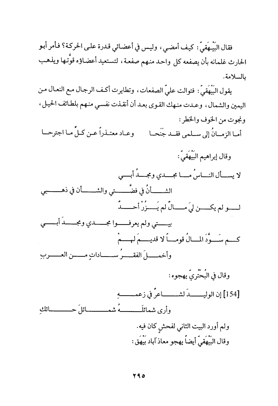 فقال البيهقيّ: كيف أمضي، وليس في أعضائي قدرة على الحركة؟ فأمر أبو الحارث غلمانه بأن يصفعه كل واحد منهم صفعة، لتستعيد أعضاؤه قوّتها ويذهب بالسلامة.