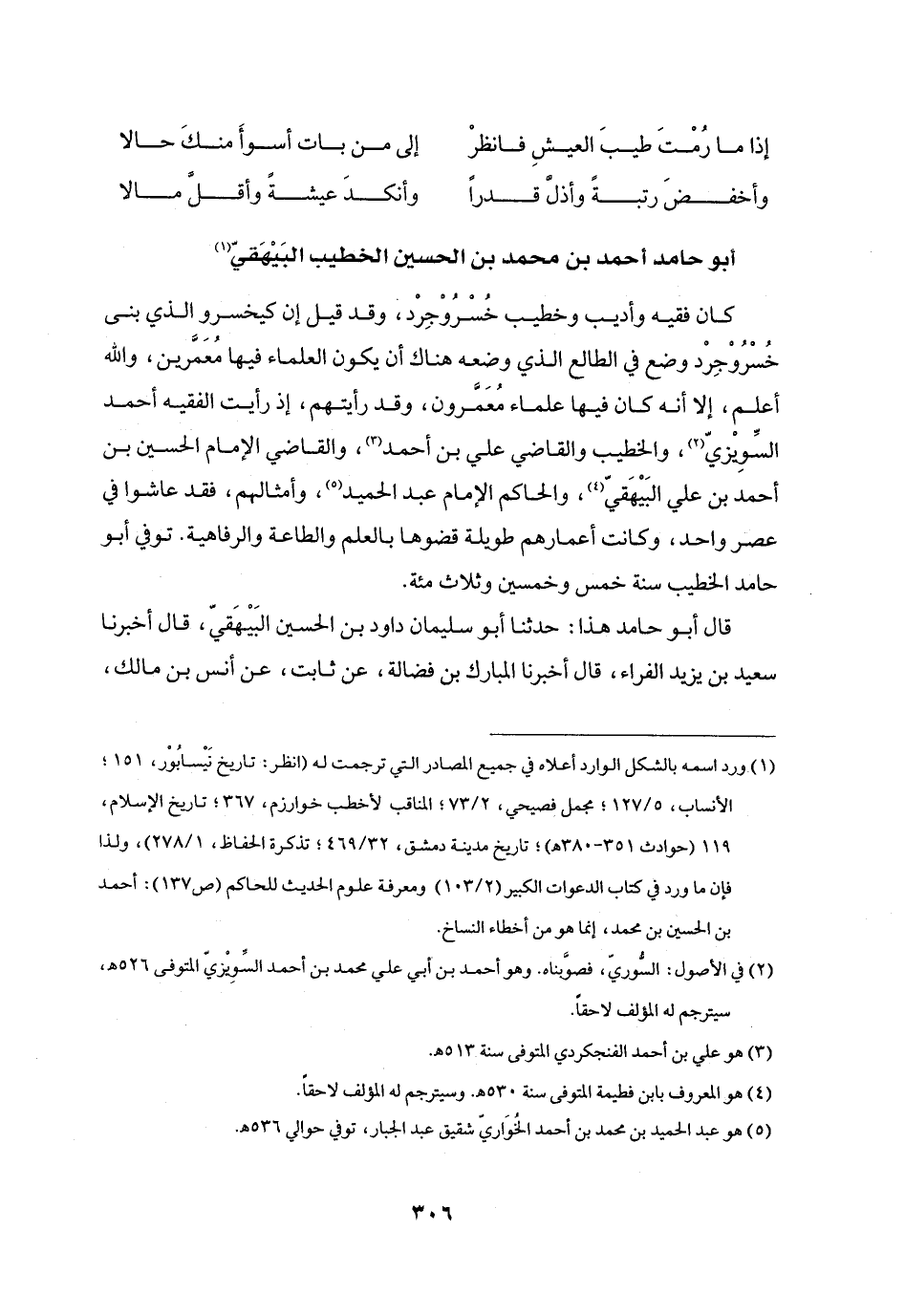 كان فقيه وأديب وخطيب خسروجرد، وقد قيل إن كيخسرو الذي بنى خسروجرد وضع في الطالع الذي وضعه هناك أن يكون العلماء فيها معمّرين، والله أعلم، إلا أنه كان فيها علماء معمّرون، وقد رأيتهم، إذ رأيت الفقيه أحمد السّويزيّ «2» ، والخطيب والقاضي علي بن أحمد «3» ، والقاضي الإمام الحسين بن أحمد بن علي البيهقيّ «4» ، والحاكم الإمام عبد الحميد «5» ، وأمثالهم، فقد عاشوا في عصر واحد، وكانت أعمارهم طويلة قضوها بالعلم والطاعة والرفاهية. توفي أبو حامد الخطيب سنة خمس وخمسين وثلاث مئة.