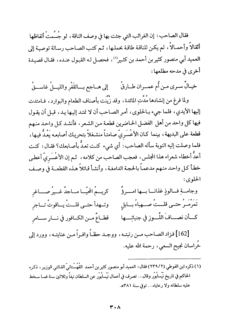 فقال الصاحب: إن الغرائب التي جئت بها في وصف الناقة، لو جسّمت ألفاظها أثقالا وأحمالا، لم يكن للناقة طاقة بحملها، ثم كتب الصاحب رسالة توصية إلى العميد أبي منصور كثير بن أحمد بن كثير «1» ، فحصل له القبول عنده، فقال قصيدة أخرى في مدحه مطلعها: