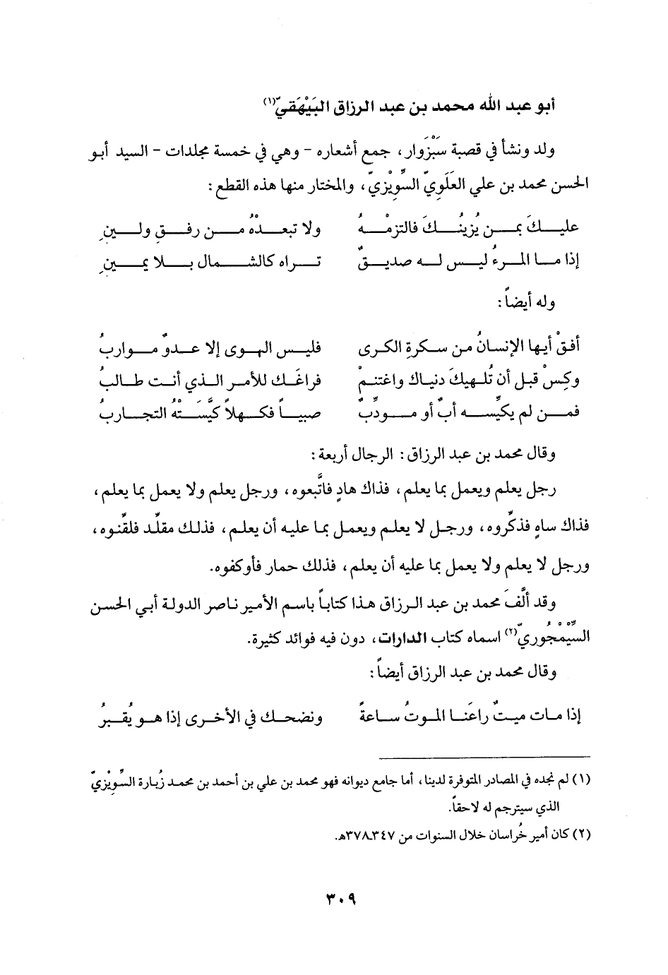 وقد ألّف محمد بن عبد الرزاق هذا كتابا باسم الأمير ناصر الدولة أبي الحسن السّيمجوريّ «2» اسماه كتاب الدارات، دون فيه فوائد كثيرة.