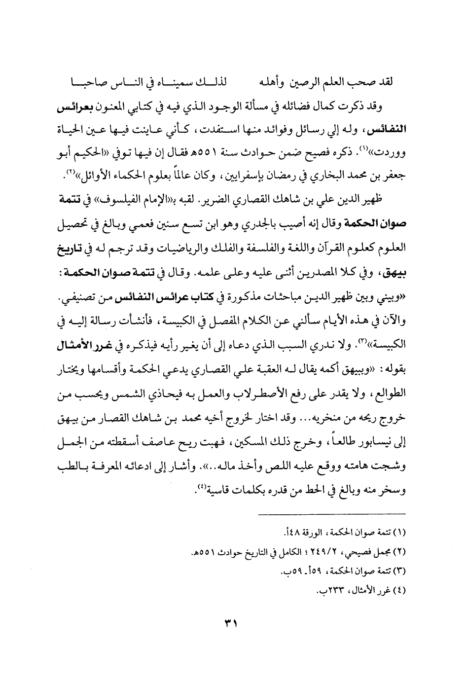 وقد ذكرت كمال فضائله في مسألة الوجود الذي فيه في كتابي المعنون بعرائس النفائس، وله إلي رسائل وفوائد منها استفدت، كأني عاينت فيها عين الحياة ووردت» «1» . ذكره فصيح ضمن حوادث سنة 551 هـ فقال إن فيها توفي «الحكيم أبو جعفر بن محمد البخاري في رمضان بإسفرايين، وكان عالما بعلوم الحكماء الأوائل» «2» .