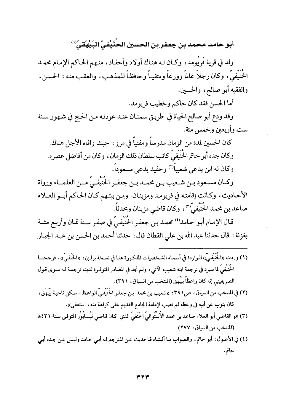 وكان مسعود بن شعيب بن محمد بن جعفر الحنيفيّ من العلماء ورواة الأحاديث، وكانت إقامته في فريومد ومزينان. ومن بيتهم كان الحاكم أبو العلاء صاعد بن محمد الحنيفيّ «3» ، وكان قاضي مزينان ومحدثا.