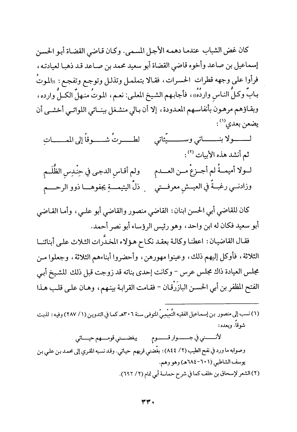 كان غض الشباب عند ما دهمه الأجل المسمى. وكان قاضي القضاة أبو الحسن إسماعيل بن صاعد وأخوه قاضي القضاة أبو سعيد محمد بن صاعد قد ذهبا لعيادته، فرأوا على وجهه قطرات الحسرات، فقالا بتململ وتذلل وتوجع وتفجع: «الموت باب وكلّ الناس وارده» ، فأجابهم الشيخ المعلى: نعم، الموت منهل الكلّ وارده، وبقاؤهم مرهون بأنفاسهم المعدودة، إلا أن بالي منشغل ببناتي اللواتي أخشى أن يضعن بعدي «1» :