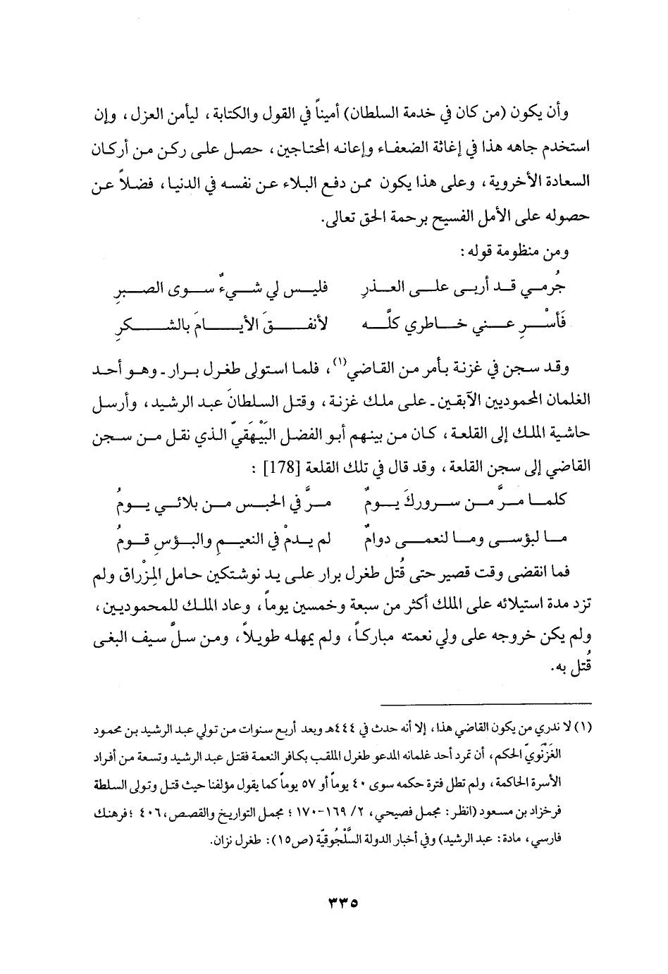 وقد سجن في غزنة بأمر من القاضي «1» ، فلما استولى طغرل برار- وهو أحد الغلمان المحموديين الآبقين- على ملك غزنة، وقتل السلطان عبد الرشيد، وأرسل حاشية الملك إلى القلعة، كان من بينهم أبو الفضل البيهقيّ الذي نقل من سجن القاضي إلى سجن القلعة، وقد قال في تلك القلعة [178] :