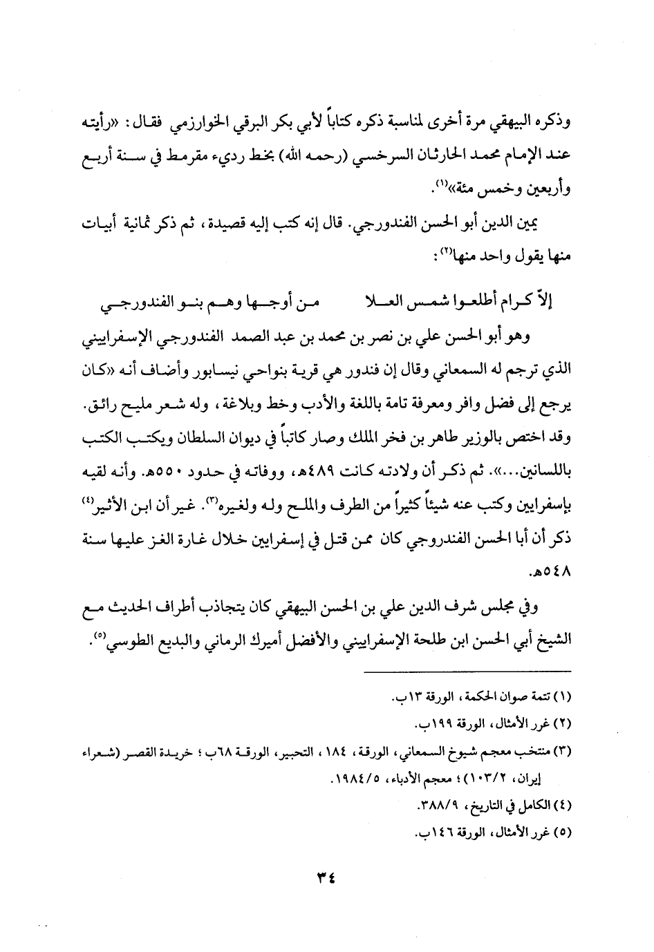 وفي مجلس شرف الدين علي بن الحسن البيهقي كان يتجاذب أطراف الحديث مع الشيخ أبي الحسن ابن طلحة الإسفراييني والأفضل أميرك الرماني والبديع الطوسي «5» .