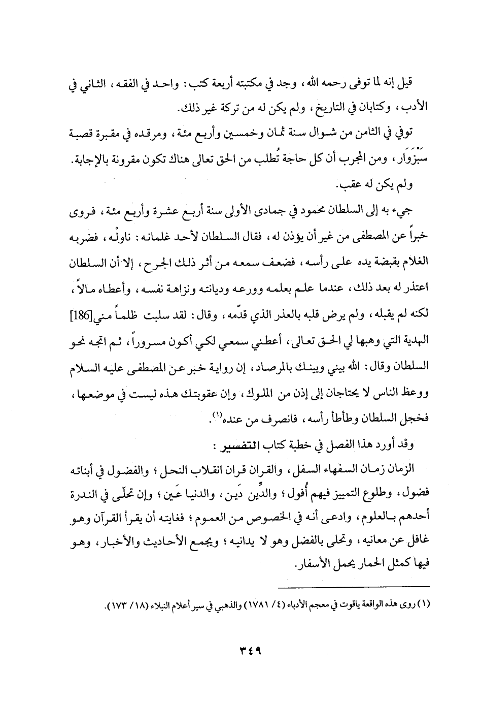 الزمان زمان السفهاء السفل، والقران قران انقلاب النحل؛ والفضول في أبنائه فضول، وطلوع التمييز فيهم أفول؛ والدّين دين، والدنيا عين؛ وإن تحلّى في الندرة أحدهم بالعلوم، وادعى أنه في الخصوص من العموم؛ فغايته أن يقرأ القرآن وهو غافل عن معانيه، وتحلى بالفضل وهو لا يدانيه؛ ويجمع الأحاديث والأخبار، وهو فيها كمثل الحمار يحمل الأسفار.