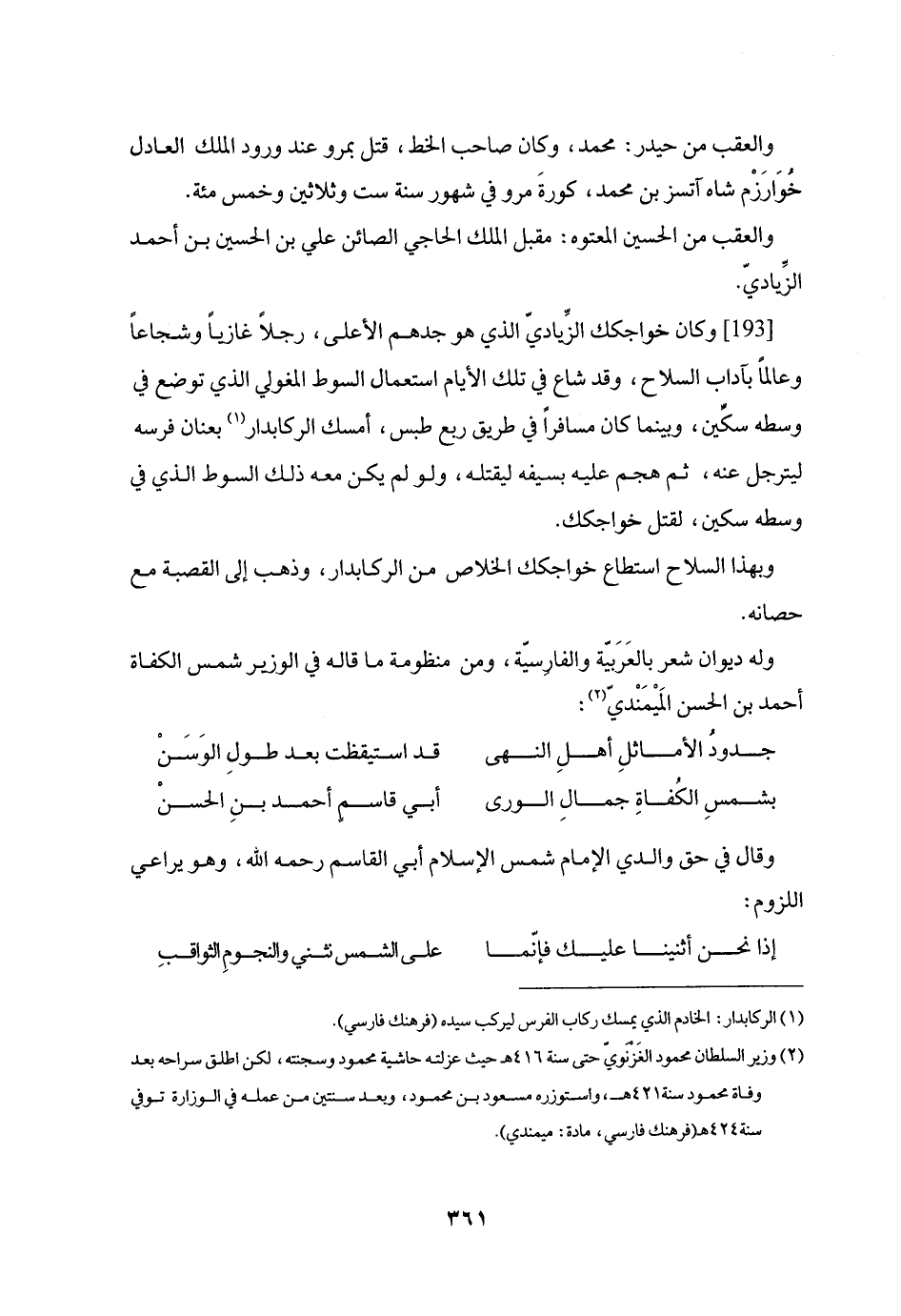 [193] وكان خواجكك الزّياديّ الذي هو جدهم الأعلى، رجلا غازيا وشجاعا وعالما بآداب السلاح، وقد شاع في تلك الأيام استعمال السوط المغولي الذي توضع في وسطه سكّين، وبينما كان مسافرا في طريق ربع طبس، أمسك الركابدار «1» بعنان فرسه ليترجل عنه، ثم هجم عليه بسيفه ليقتله، ولو لم يكن معه ذلك السوط الذي في وسطه سكين، لقتل خواجكك.