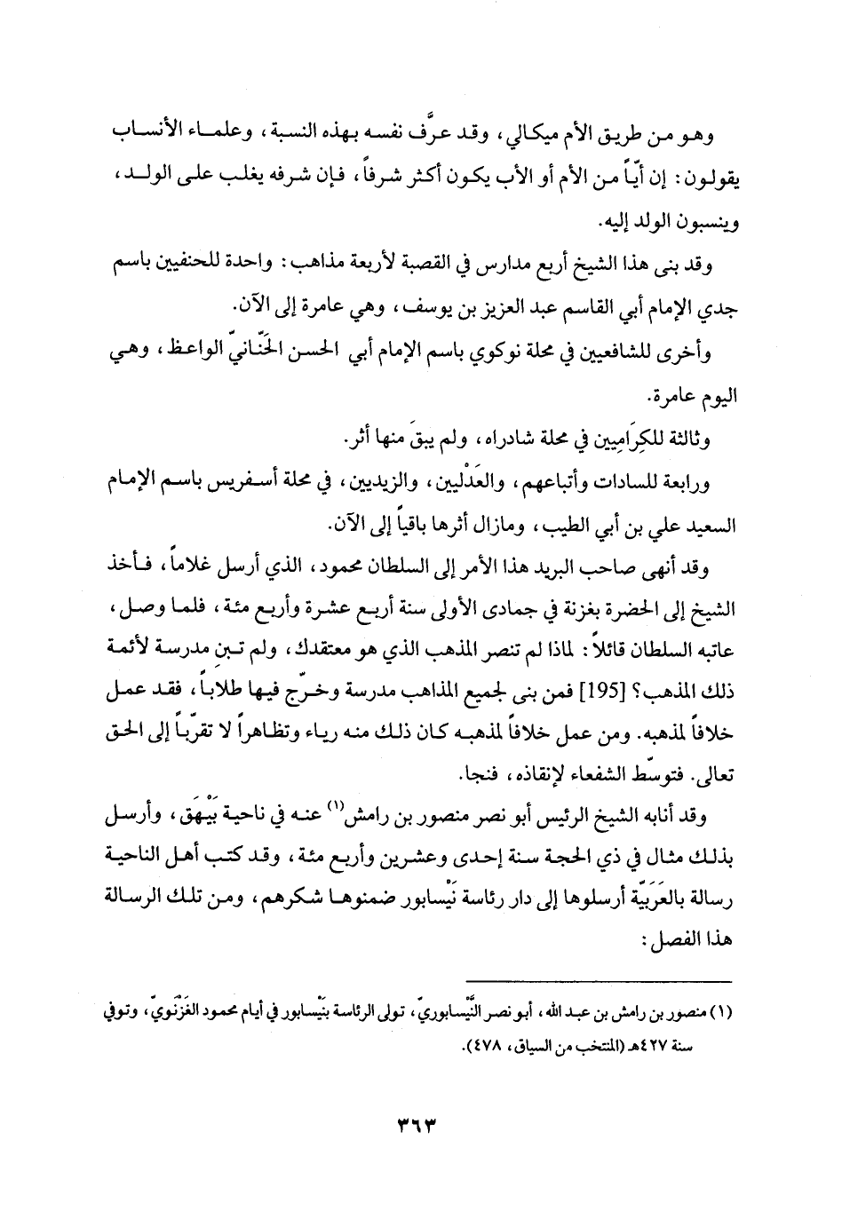 وقد أنابه الشيخ الرئيس أبو نصر منصور بن رامش «1» عنه في ناحية بيهق، وأرسل بذلك مثال في ذي الحجة سنة إحدى وعشرين وأربع مئة، وقد كتب أهل الناحية رسالة بالعربيّة أرسلوها إلى دار رئاسة نيسابور ضمنوها شكرهم، ومن تلك الرسالة هذا الفصل: