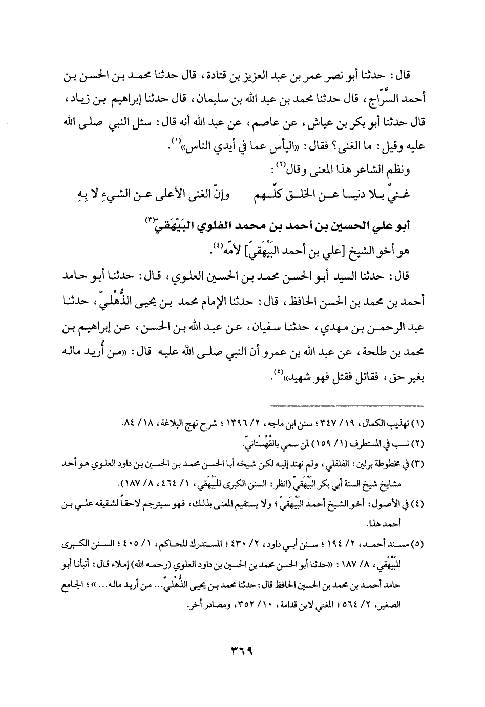 قال: حدثنا السيد أبو الحسن محمد بن الحسين العلوي، قال: حدثنا أبو حامد أحمد بن محمد بن الحسن الحافظ، قال: حدثنا الإمام محمد بن يحيى الذّهليّ، حدثنا عبد الرحمن بن مهدي، حدثنا سفيان، عن عبد الله بن الحسن، عن إبراهيم بن محمد بن طلحة، عن عبد الله بن عمرو أن النبي صلى الله عليه قال: «من أريد ماله بغير حق، فقاتل فقتل فهو شهيد» «5» .