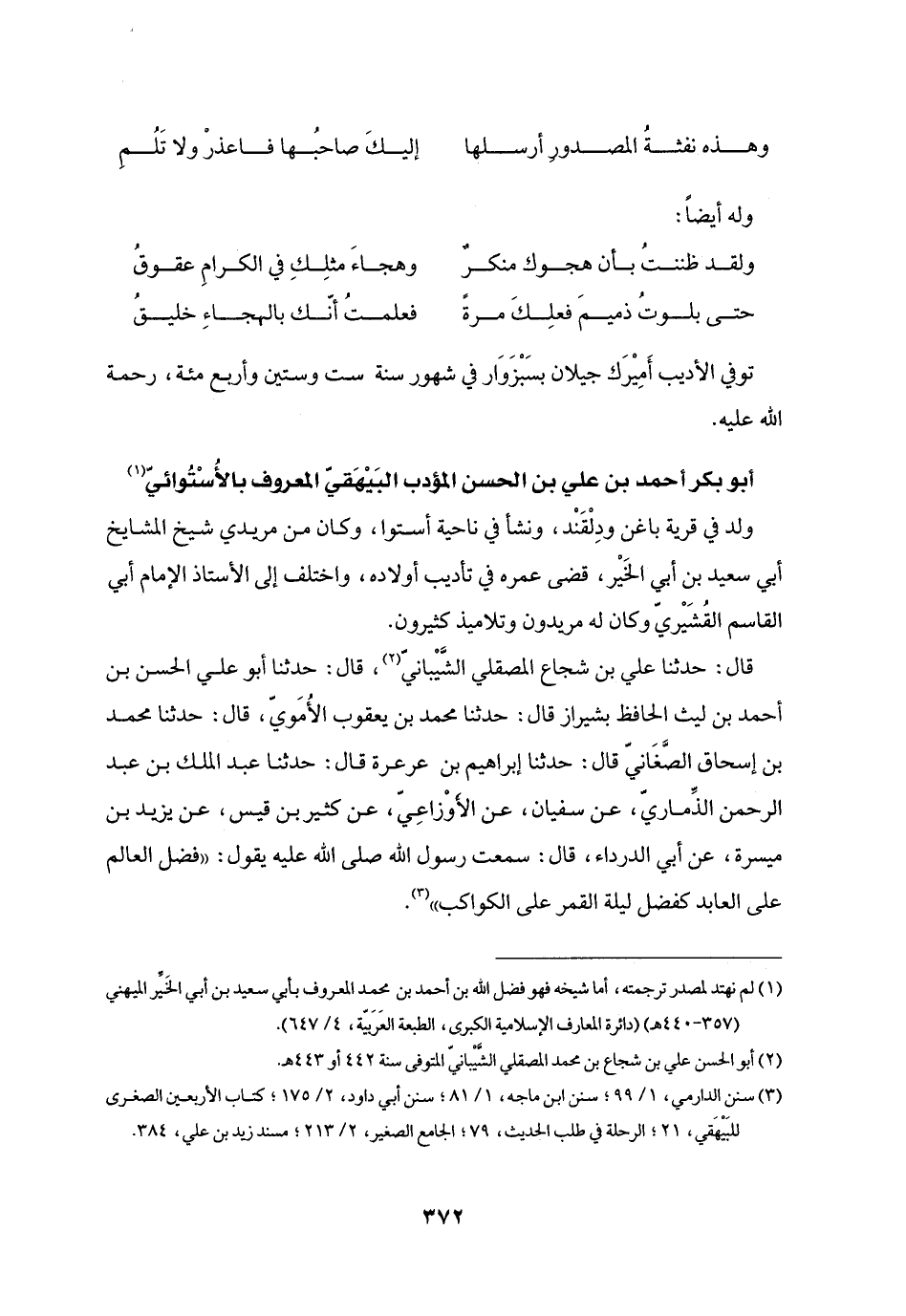قال: حدثنا علي بن شجاع المصقلي الشّيبانيّ «2» ، قال: حدثنا أبو علي الحسن بن أحمد بن ليث الحافظ بشيراز قال: حدثنا محمد بن يعقوب الأمويّ، قال: حدثنا محمد بن إسحاق الصّغانيّ قال: حدثنا إبراهيم بن عرعرة قال: حدثنا عبد الملك بن عبد الرحمن الذّماريّ، عن سفيان، عن الأوزاعيّ، عن كثير بن قيس، عن يزيد بن ميسرة، عن أبي الدرداء، قال: سمعت رسول الله صلى الله عليه يقول: «فضل العالم على العابد كفضل ليلة القمر على الكواكب» «3» .