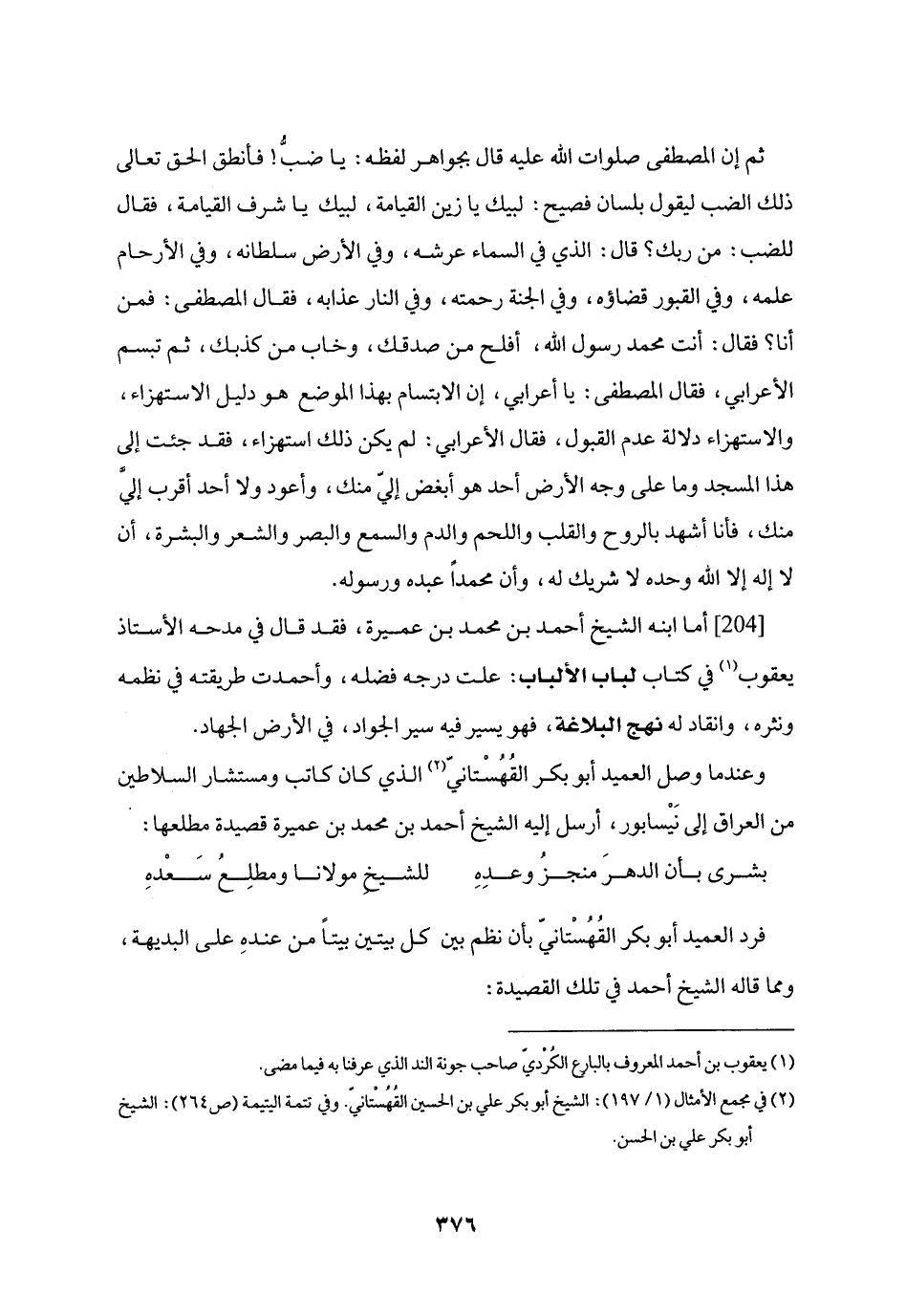 ثم إن المصطفى صلوات الله عليه قال بجواهر لفظه: يا ضبّ! فأنطق الحق تعالى ذلك الضب ليقول بلسان فصيح: لبيك يا زين القيامة، لبيك يا شرف القيامة، فقال للضب: من ربك؟ قال: الذي في السماء عرشه، وفي الأرض سلطانه، وفي الأرحام علمه، وفي القبور قضاؤه، وفي الجنة رحمته، وفي النار عذابه، فقال المصطفى: فمن أنا؟ فقال: أنت محمد رسول الله، أفلح من صدقك، وخاب من كذبك، ثم تبسم الأعرابي، فقال المصطفى: يا أعرابي، إن الابتسام بهذا الموضع هو دليل الاستهزاء، والاستهزاء دلالة عدم القبول، فقال الأعرابي: لم يكن ذلك استهزاء، فقد جئت إلى هذا المسجد وما على وجه الأرض أحد هو أبغض إليّ منك، وأعود ولا أحد أقرب إليّ منك، فأنا أشهد بالروح والقلب واللحم والدم والسمع والبصر والشعر والبشرة، أن لا إله إلا الله وحده لا شريك له، وأن محمدا عبده ورسوله.