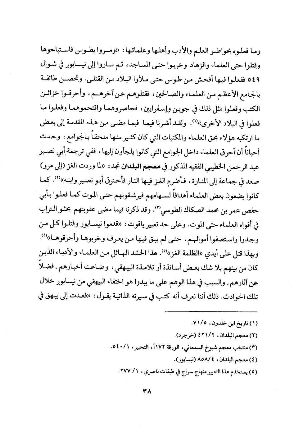 وبهذا قتل على أيدي «الظلمة الغز» «5» . هذا الحشد الهائل من العلماء والأدباء الذين كان من بينهم بلا شك بعض أساتذة أو تلامذة البيهقي، وضاعت أخبارهم- فضلا عن آثارهم- والسبب في هذا الوهم على ما يبدوا هو اختفاء البيهقي من نيسابور خلال تلك الحوادث. ذلك أننا نعرف أنه كتب في سيرته الذاتية يقول: «فعدت إلى بيهق في