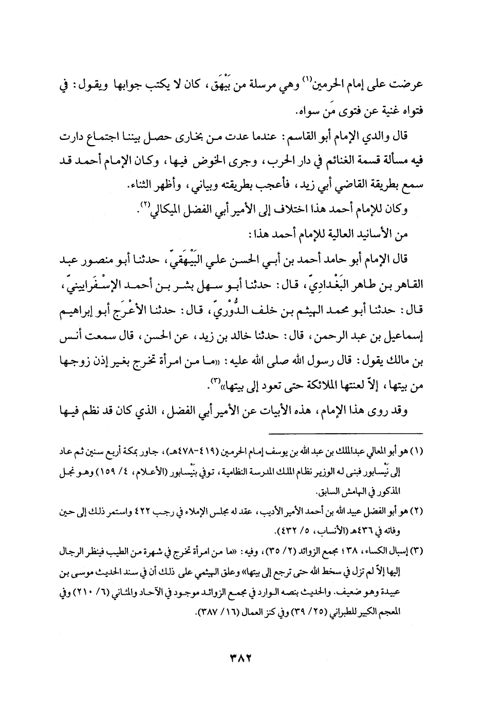 قال الإمام أبو حامد أحمد بن أبي الحسن علي البيهقيّ، حدثنا أبو منصور عبد القاهر بن طاهر البغداديّ، قال: حدثنا أبو سهل بشر بن أحمد الإسفرايينيّ، قال: حدثنا أبو محمد الهيثم بن خلف الدّوريّ، قال: حدثنا الأعرج أبو إبراهيم إسماعيل بن عبد الرحمن، قال: حدثنا خالد بن زيد، عن الحسن، قال سمعت أنس بن مالك يقول: قال رسول الله صلى الله عليه: «ما من امرأة تخرج بغير إذن زوجها من بيتها، إلّا لعنتها الملائكة حتى تعود إلى بيتها» «3» .