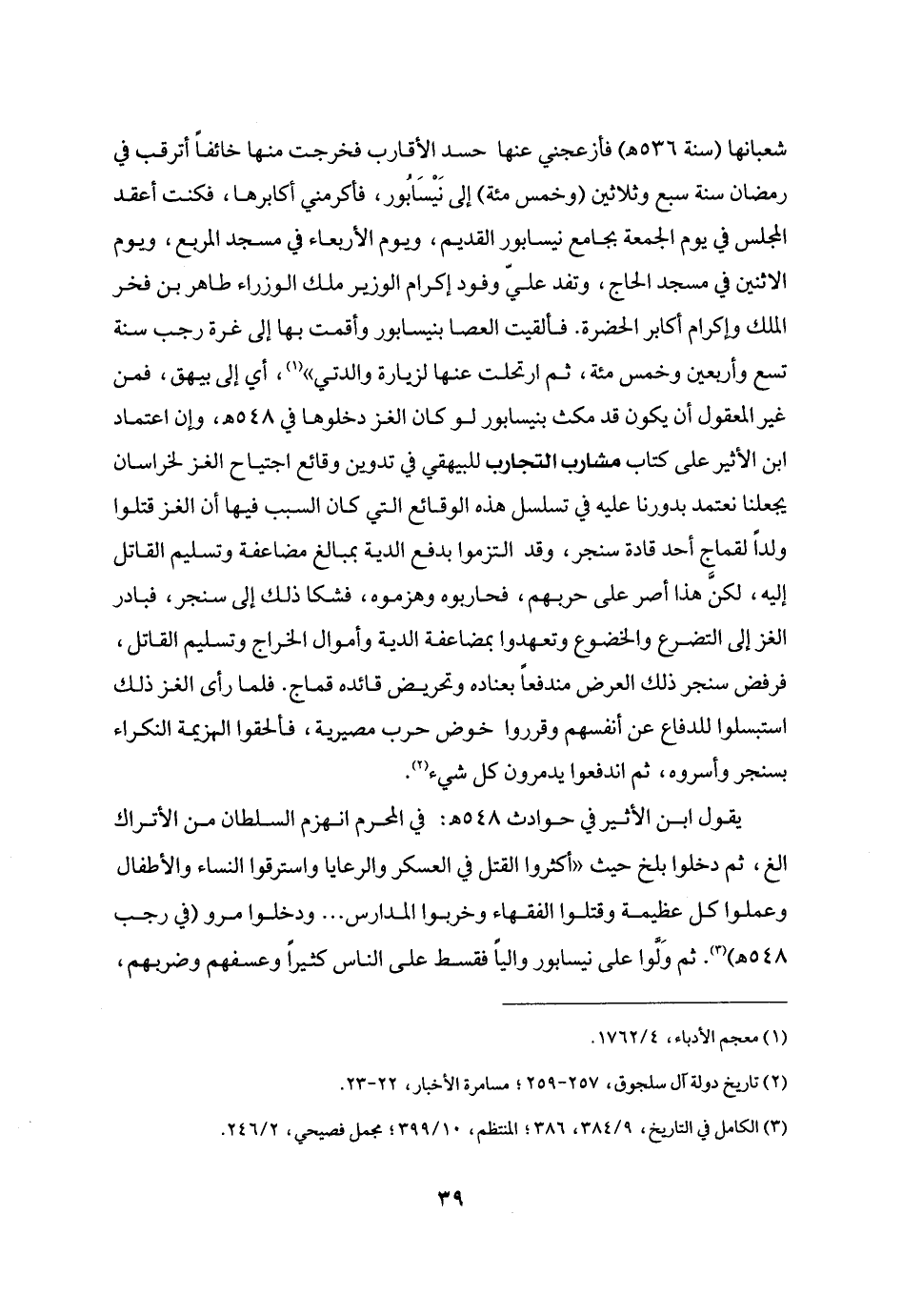 شعبانها (سنة 536 هـ) فأزعجني عنها حسد الأقارب فخرجت منها خائفا أترقب في رمضان سنة سبع وثلاثين (وخمس مئة) إلى نيسابور، فأكرمني أكابرها، فكنت أعقد المجلس في يوم الجمعة بجامع نيسابور القديم، ويوم الأربعاء في مسجد المربع، ويوم الاثنين في مسجد الحاج، وتفد عليّ وفود إكرام الوزير ملك الوزراء طاهر بن فخر الملك وإكرام أكابر الحضرة. فألقيت العصا بنيسابور وأقمت بها إلى غرة رجب سنة تسع وأربعين وخمس مئة، ثم ارتحلت عنها لزيارة والدتي» «1» ، أي إلى بيهق، فمن غير المعقول أن يكون قد مكث بنيسابور لو كان الغز دخلوها في 548 هـ، وإن اعتماد ابن الأثير على كتاب مشارب التجارب للبيهقي في تدوين وقائع اجتياح الغز لخراسان يجعلنا نعتمد بدورنا عليه في تسلسل هذه الوقائع التي كان السبب فيها أن الغز قتلوا ولدا لقماج أحد قادة سنجر، وقد التزموا بدفع الدية بمبالغ مضاعفة وتسليم القاتل إليه، لكنّ هذا أصر على حربهم، فحاربوه وهزموه، فشكا ذلك إلى سنجر، فبادر الغز إلى التضرع والخضوع وتعهدوا بمضاعفة الدية وأموال الخراج وتسليم القاتل، فرفض سنجر ذلك العرض مندفعا بعناده وتحريض قائده قماج. فلما رأى الغز ذلك استبسلوا للدفاع عن أنفسهم وقرروا خوض حرب مصيرية، فألحقوا الهزيمة النكراء بسنجر وأسروه، ثم اندفعوا يدمرون كل شيء «2» .