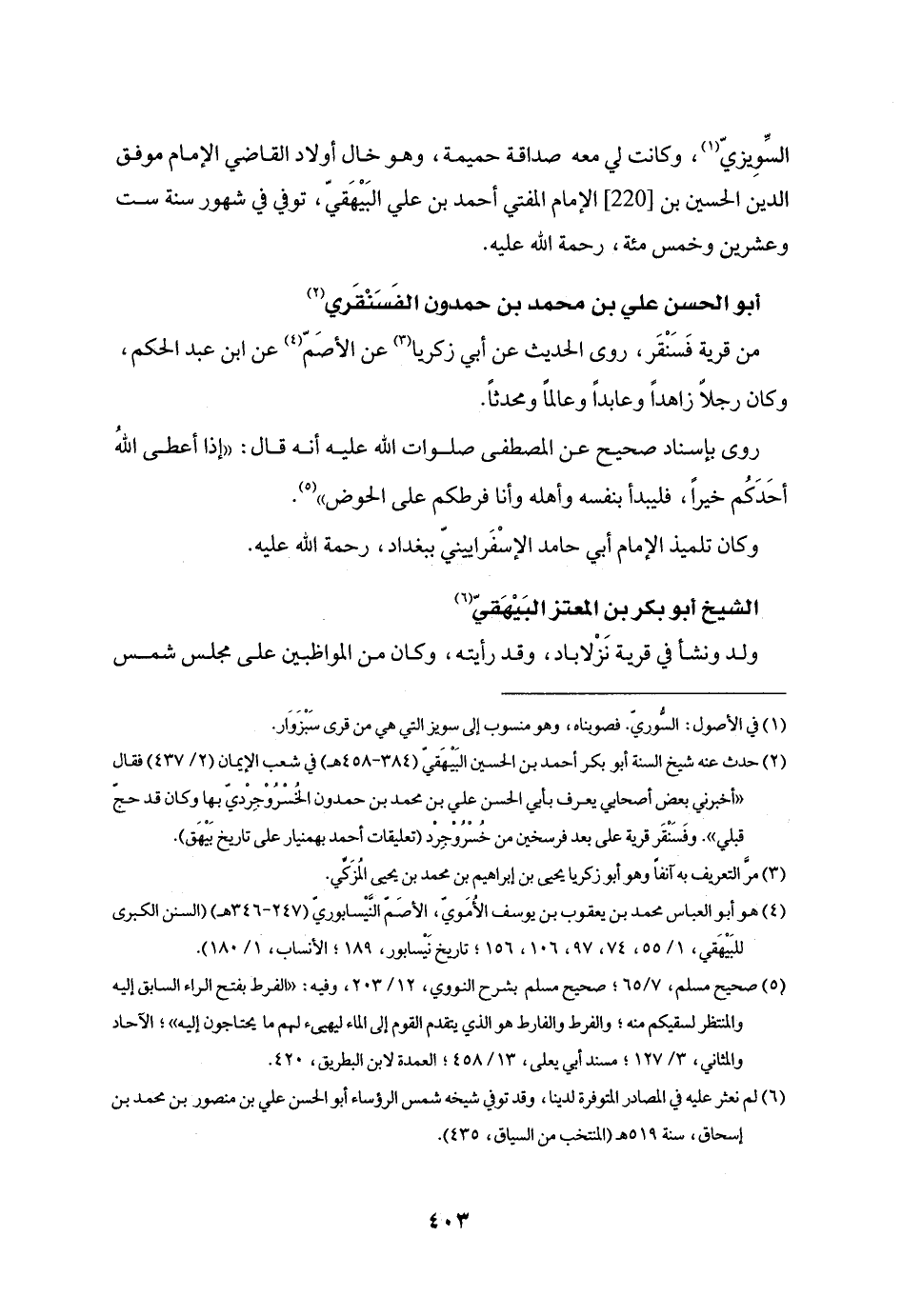 السّويزيّ «1» ، وكانت لي معه صداقة حميمة، وهو خال أولاد القاضي الإمام موفق الدين الحسين بن [220] الإمام المفتي أحمد بن علي البيهقيّ، توفي في شهور سنة ست وعشرين وخمس مئة، رحمة الله عليه.