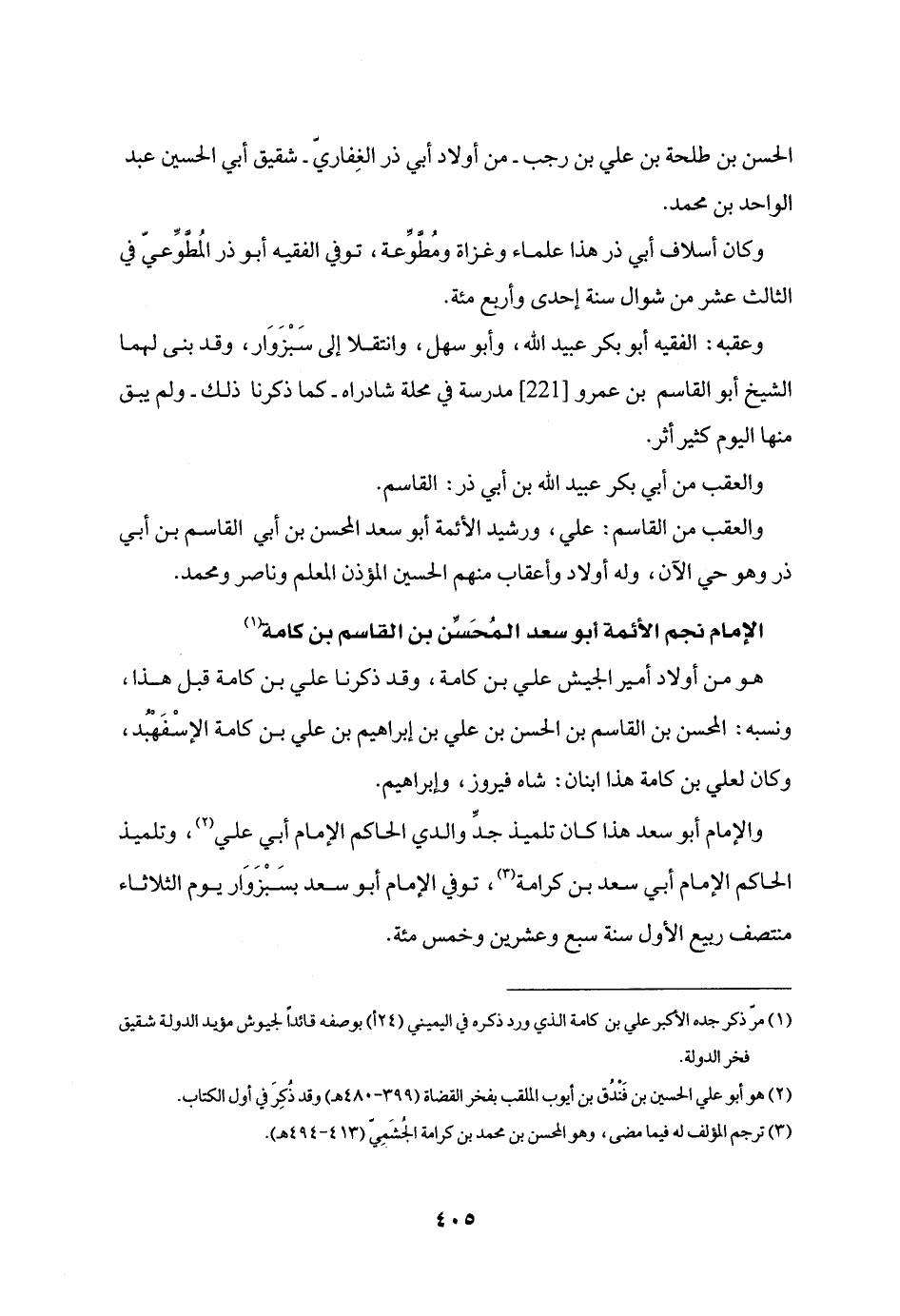 والإمام أبو سعد هذا كان تلميذ جدّ والدي الحاكم الإمام أبي علي «2» ، وتلميذ الحاكم الإمام أبي سعد بن كرامة «3» ، توفي الإمام أبو سعد بسبزوار يوم الثلاثاء منتصف ربيع الأول سنة سبع وعشرين وخمس مئة.