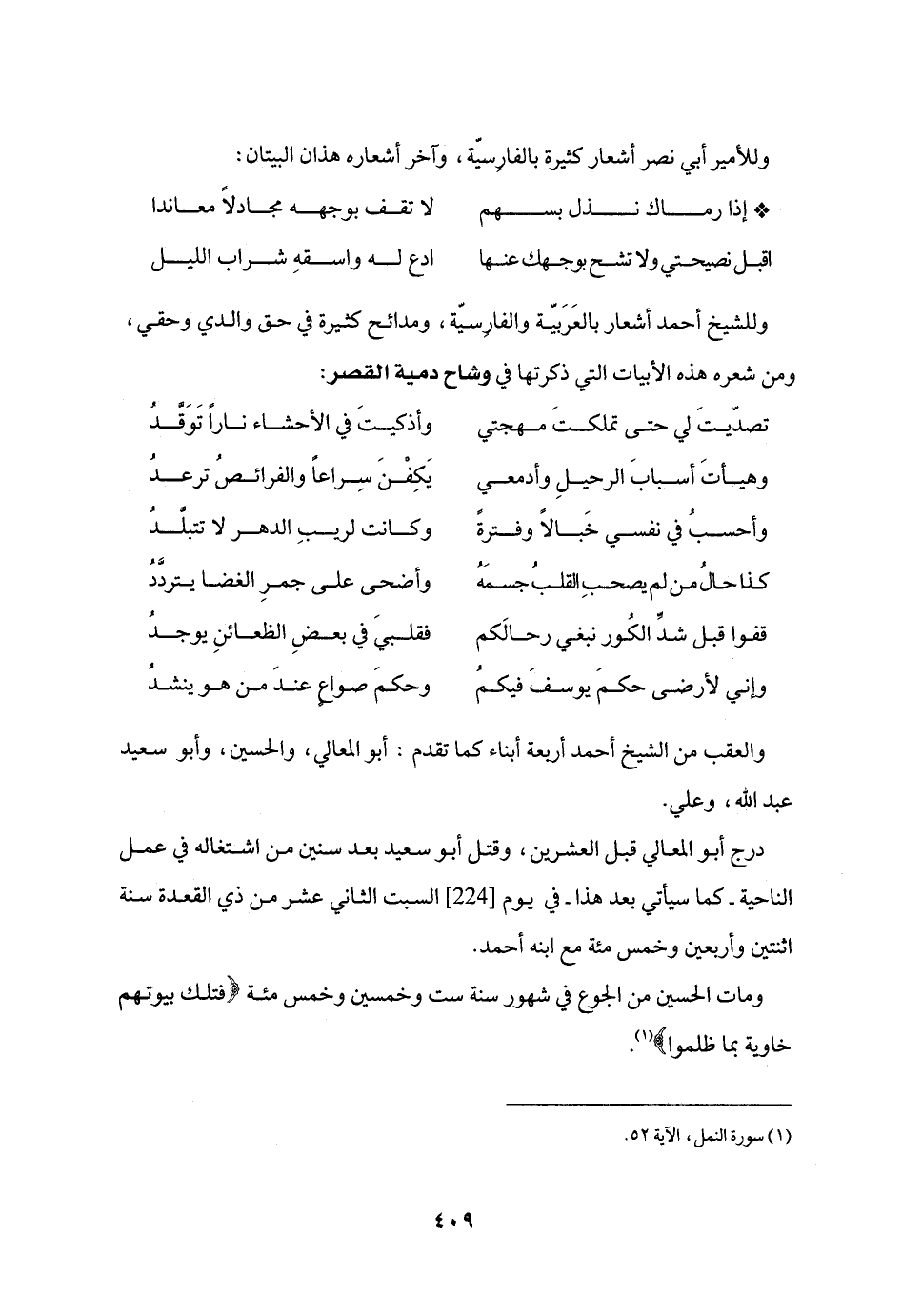 درج أبو المعالي قبل العشرين، وقتل أبو سعيد بعد سنين من اشتغاله في عمل الناحية- كما سيأتي بعد هذا- في يوم [224] السبت الثاني عشر من ذي القعدة سنة اثنتين وأربعين وخمس مئة مع ابنه أحمد.