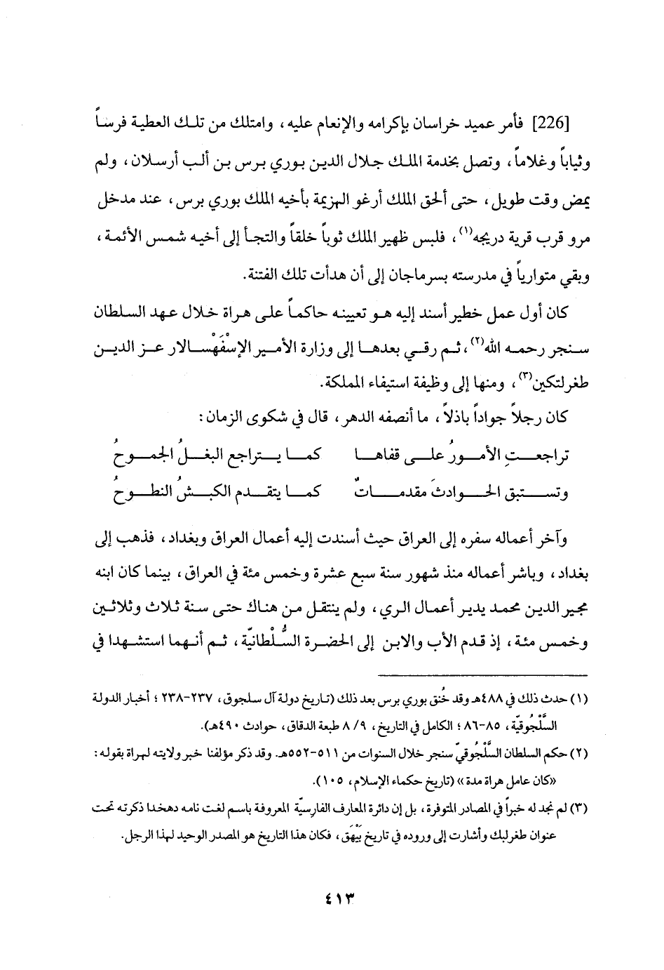 [226] فأمر عميد خراسان بإكرامه والإنعام عليه، وامتلك من تلك العطية فرسا وثيابا وغلاما، وتصل بخدمة الملك جلال الدين بوري برس بن ألب أرسلان، ولم يمض وقت طويل، حتى ألحق الملك أرغو الهزيمة بأخيه الملك بوري برس، عند مدخل مرو قرب قرية دريجه «1» ، فلبس ظهير الملك ثوبا خلقا والتجأ إلى أخيه شمس الأئمة، وبقي متواريا في مدرسته بسرماجان إلى أن هدأت تلك الفتنة.