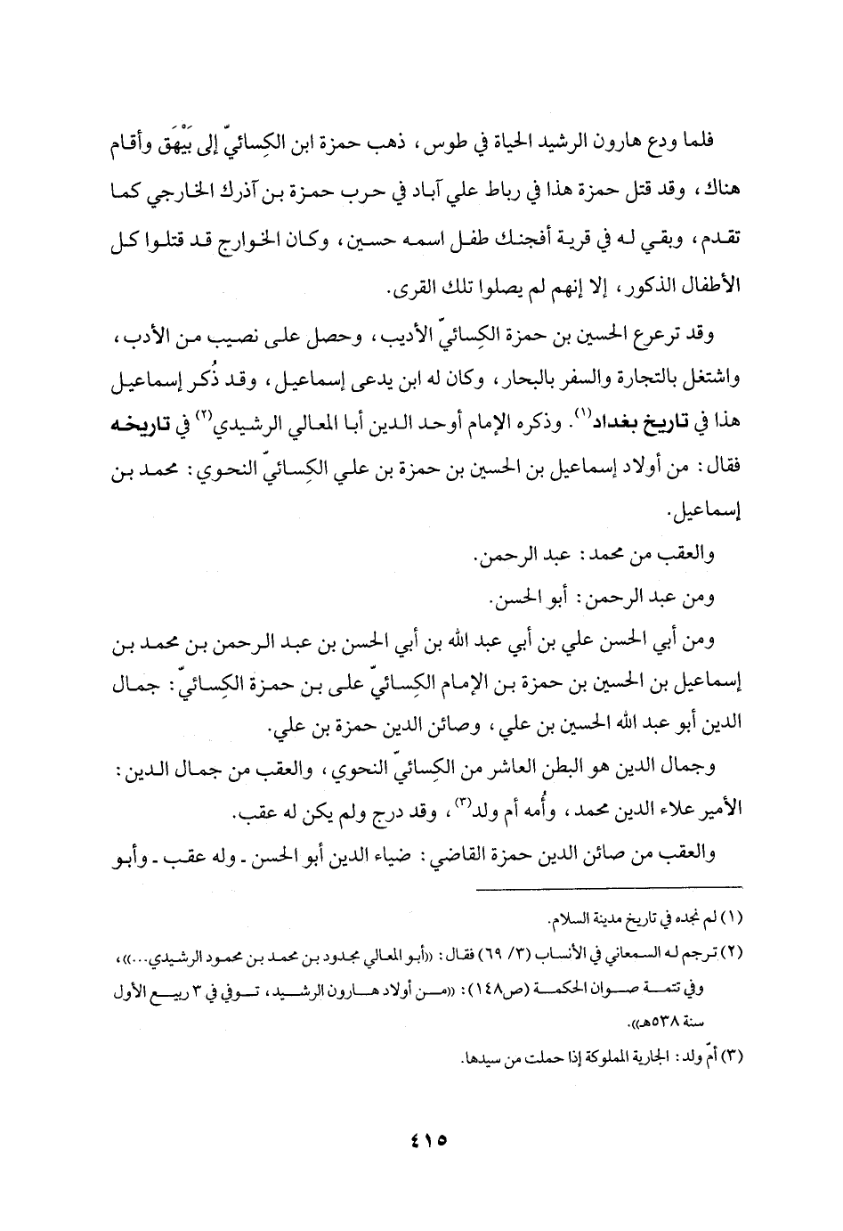 وقد ترعرع الحسين بن حمزة الكسائيّ الأديب، وحصل على نصيب من الأدب، واشتغل بالتجارة والسفر بالبحار، وكان له ابن يدعى إسماعيل، وقد ذكر إسماعيل هذا في تاريخ بغداد «1» . وذكره الإمام أوحد الدين أبا المعالي الرشيدي «2» في تاريخه فقال: من أولاد إسماعيل بن الحسين بن حمزة بن علي الكسائيّ النحوي: محمد بن إسماعيل.