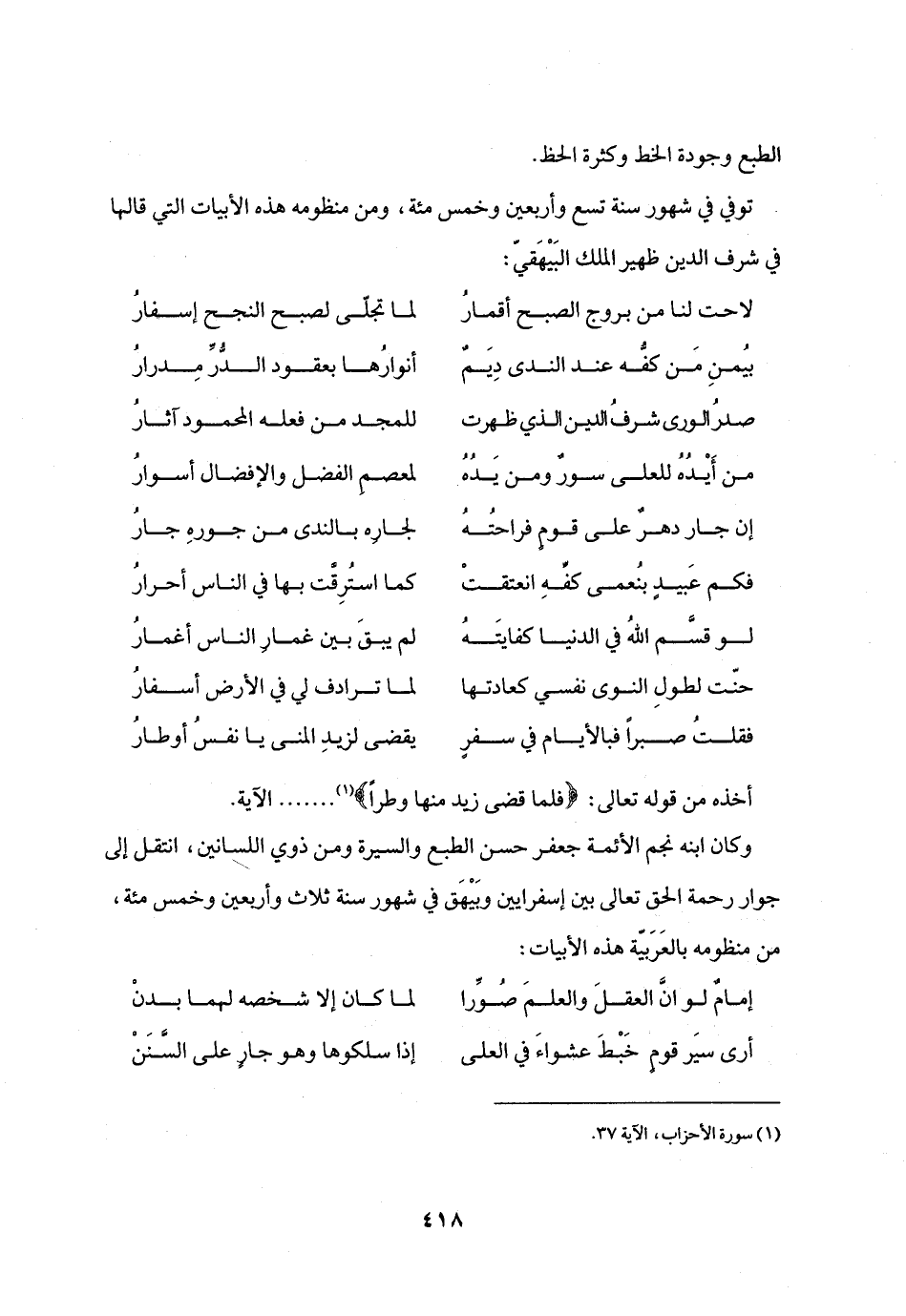 توفي في شهور سنة تسع وأربعين وخمس مئة، ومن منظومه هذه الأبيات التي قالها في شرف الدين ظهير الملك البيهقيّ: