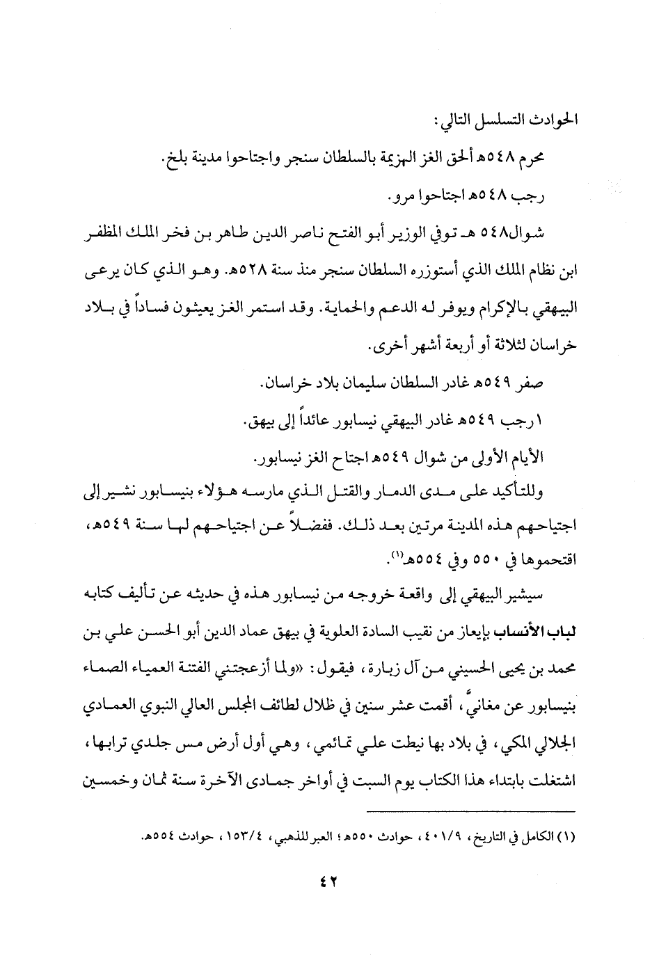 شوال 548 هـ توفي الوزير أبو الفتح ناصر الدين طاهر بن فخر الملك المظفر ابن نظام الملك الذي أستوزره السلطان سنجر منذ سنة 528 هـ. وهو الذي كان يرعى البيهقي بالإكرام ويوفر له الدعم والحماية. وقد استمر الغز يعيثون فسادا في بلاد خراسان لثلاثة أو أربعة أشهر أخرى.