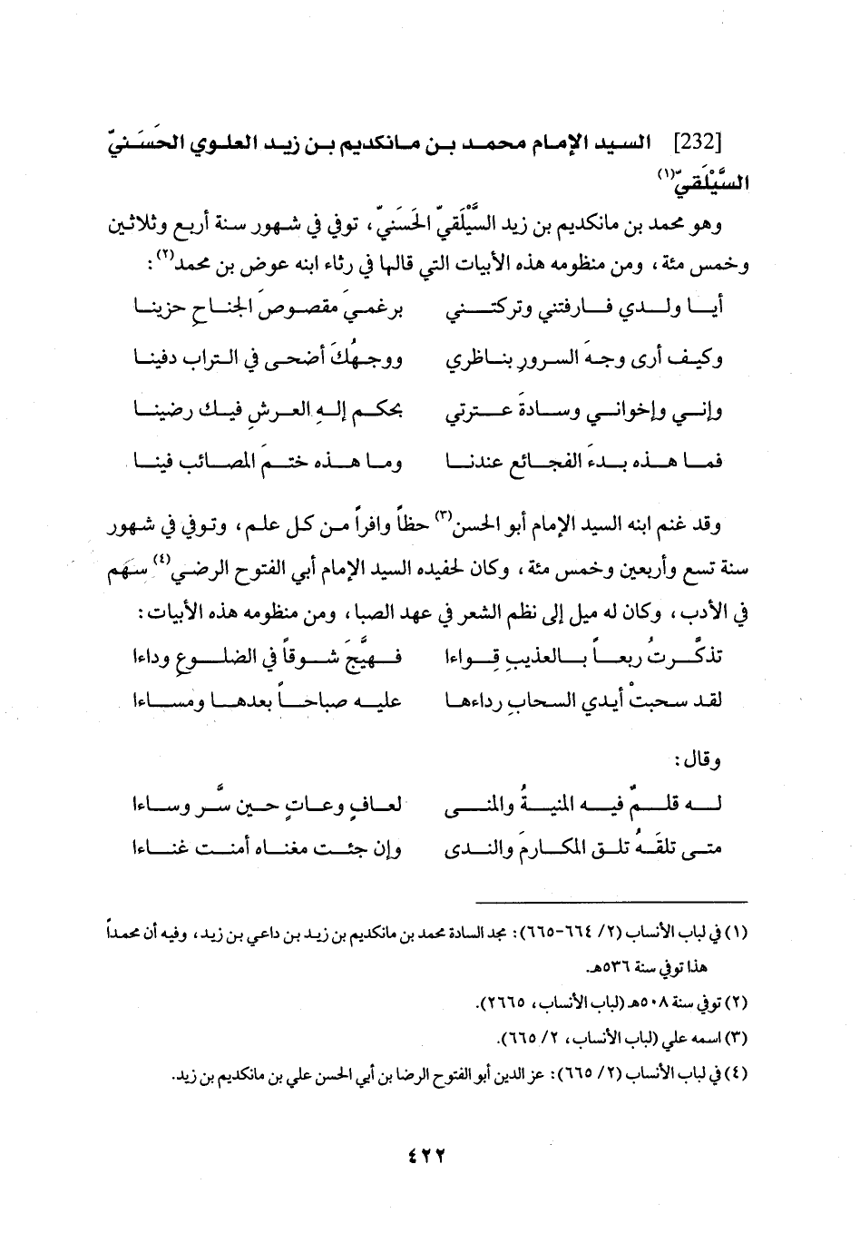 وهو محمد بن مانكديم بن زيد السّيلقيّ الحسنيّ، توفي في شهور سنة أربع وثلاثين وخمس مئة، ومن منظومه هذه الأبيات التي قالها في رثاء ابنه عوض بن محمد «2» :