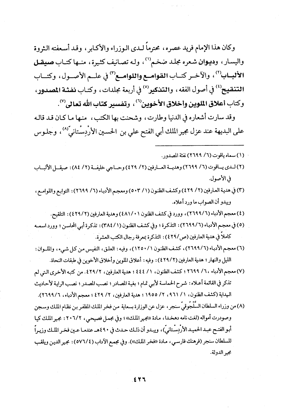 وكان هذا الإمام فريد عصره، محترما لدى الوزراء والأكابر، وقد أسعفته الثروة واليسار، وديوان شعره مجلد ضخم «1» ، وله تصانيف كثيرة، منها كتاب صيقل الألباب «2» ، والآخر كتاب القوامع واللوامع «3» في علم الأصول، وكتاب التنقيح «4» في أصول الفقه، والتذكير «5» في أربعة مجلدات، وكتاب نفثة المصدور، وكتاب أعلاق الملوين وأخلاق الأخوين «6» ، وتفسير كتاب الله تعالى «7» .